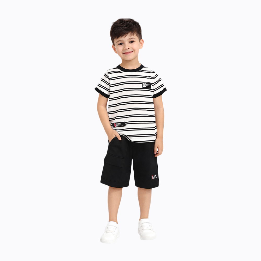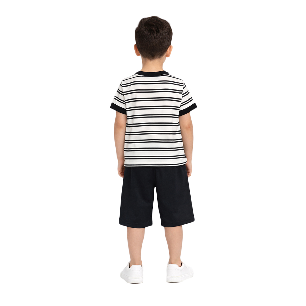 طقم ولادي كاجوال مكون من فنيلة مخططة بخطوط رفيعة ، قصة عنق دائرية ، أكمام قصيرة ، و بنطلون شورت بجيب امامي