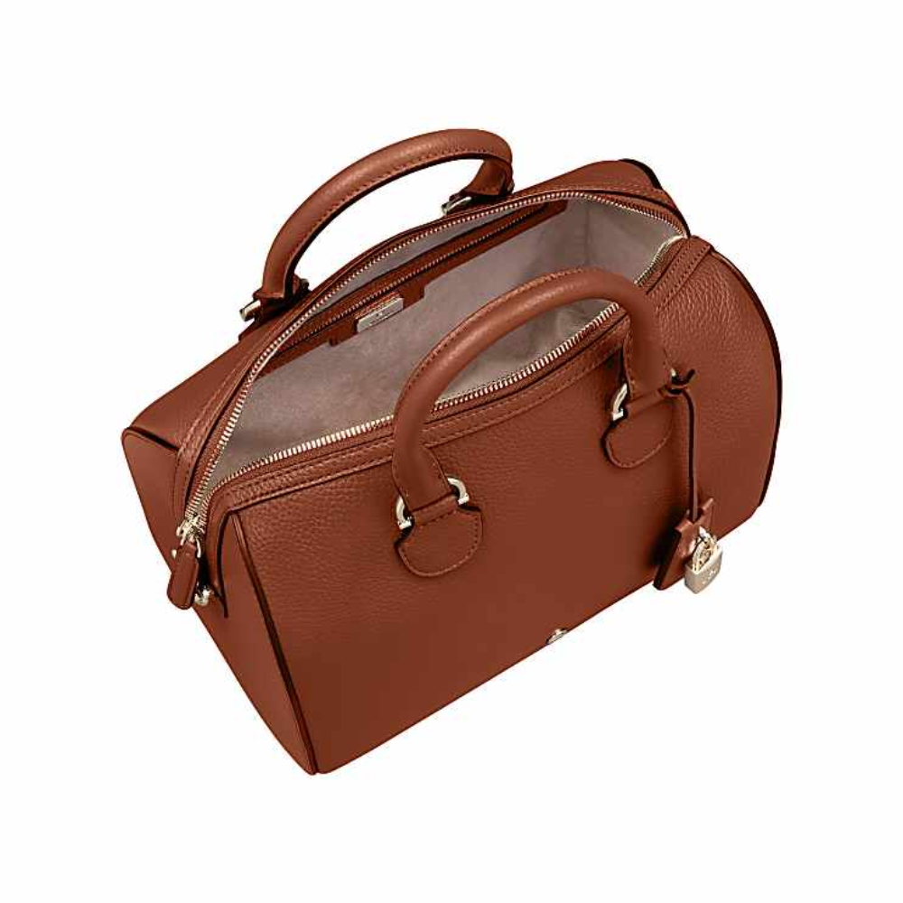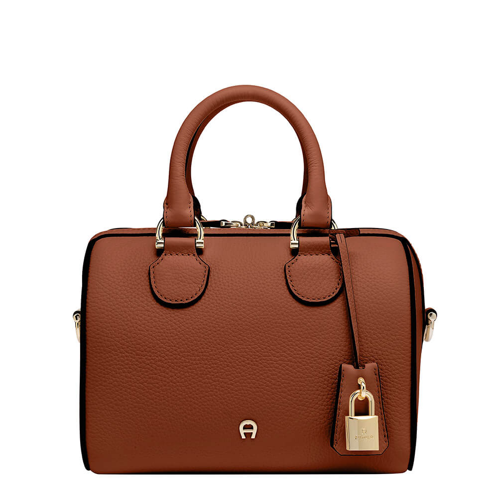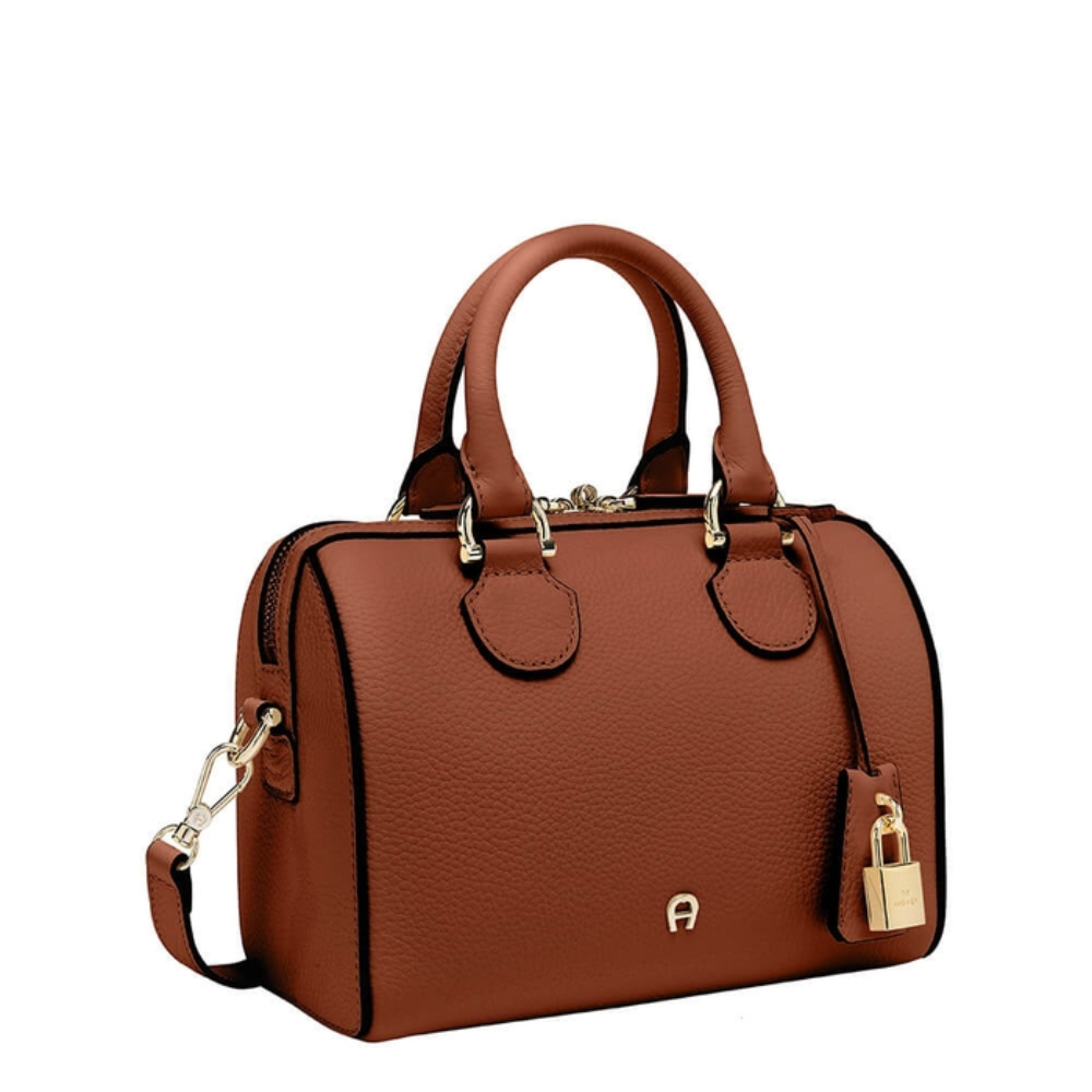 حقيبة يد بتصميم انيق وعملي تحتوي على مقبضين علويين قصيرين للحمل باليد، بالإضافة إلى حزام كتف قابل للتعديل والفصل مما يتيح حملها بطرق مختلفة و تُغلق بسحاب علوي، وتتميز بأجزاء معدنية لامعة بلون ذهبي فاتح، بما في ذلك قفل صغير مزخرف معلق على أحد المقابض يضيف
