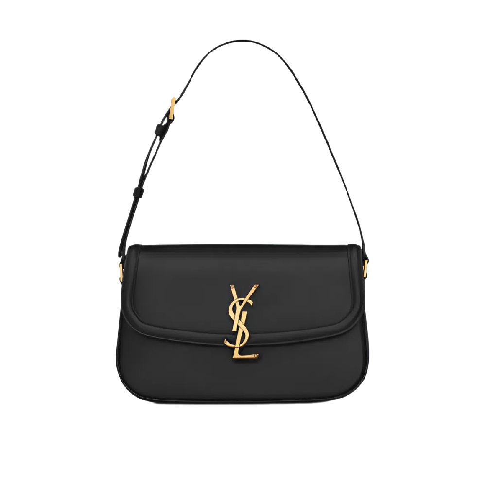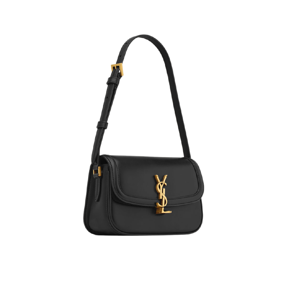 تتميز بتصميم أنيق وبسيط، مع شعار YSL الذهبي البارز على الواجهة الأمامية. تحتوي على حزام كتف رفيع قابل للتعديل باللون الأسود، وتصميمها العام يوحي بالفخامة والرقي