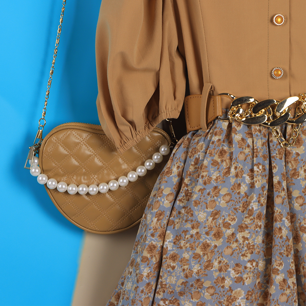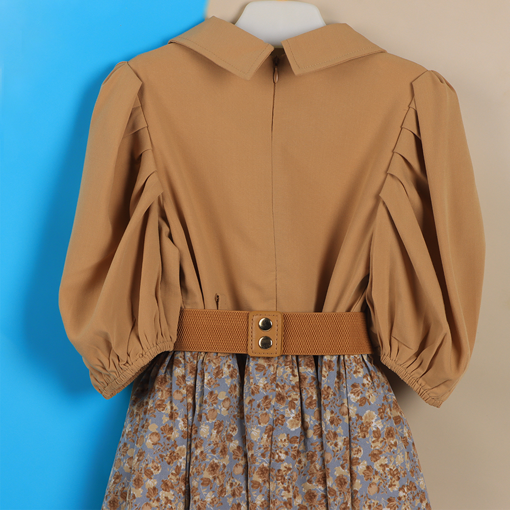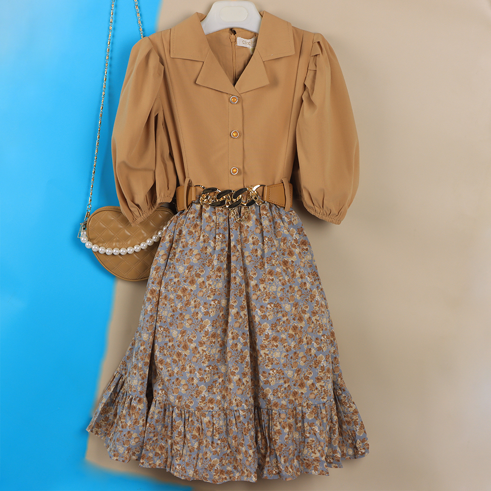 فستان بناتي أنيق يجمع بين الكلاسيكية والعصرية بأكمام طويلة منفوشة وياقة عريضة مع أزرار أمامية تمنحه لمسة راقية تنورته مزينة بنقشة ورود صغيرة مع طبقة كشكش تضيف حيوية وحركة ويزين الخصر حزام بلون متناسق بتفاصيل ذهبية يكتمل المظهر بحقيبة أنيقة بيد لؤلؤية جذابة