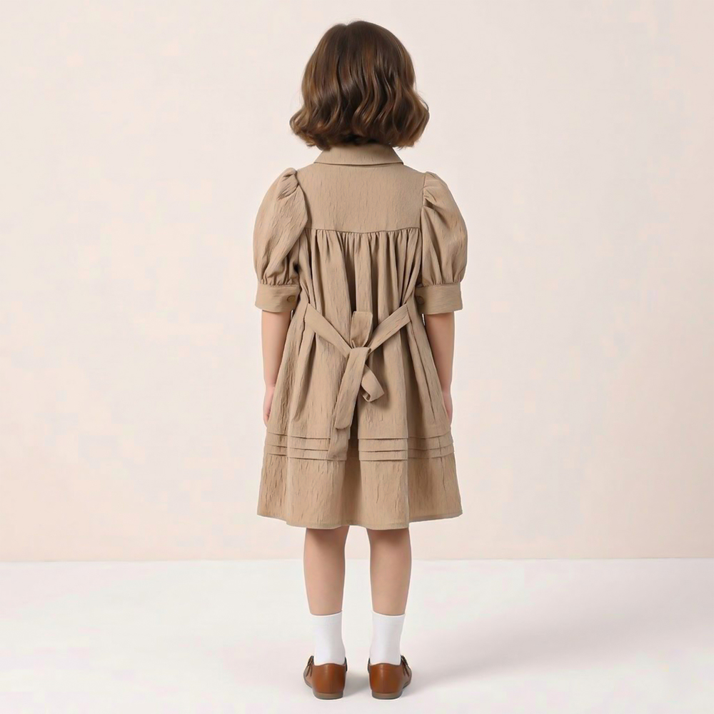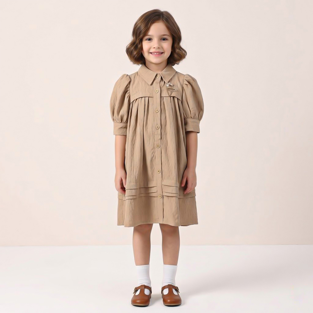 فستان بناتي أنيق بتصميم كلاسيكي مزود بأكمام منفوشة وياقة عريضة مع أزرار أمامية وزخرفة جميلة على الصدر