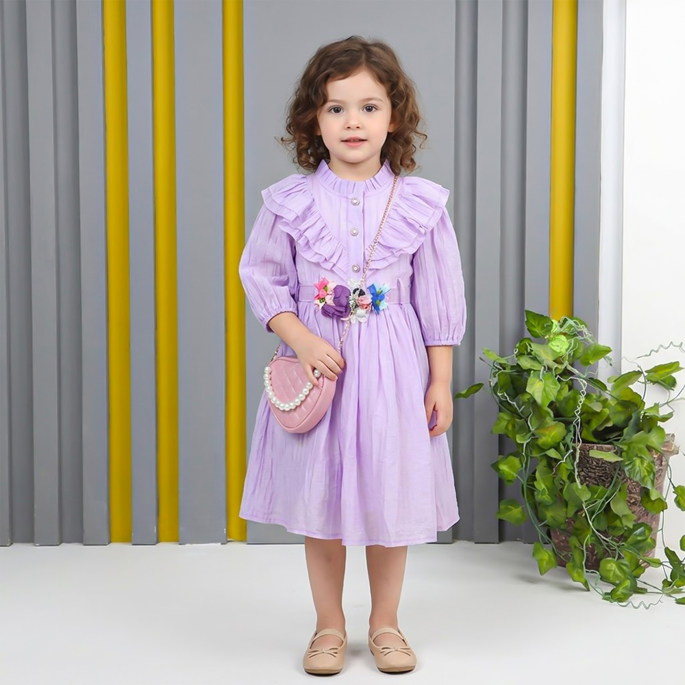 فستان بناتي بتصميم ناعم وأنيق يتميز بأكمام نصف طويلة مع أزرار أمامية وزخرفة كشكش على الصدر لإضافة لمسة أنثوية مميزة يزينه حزام مزخرف بزهور ملونة لإطلالة جذابة ويأتي معه حقيبة صغيرة وردية أنيقة بسلسلة ذهبية وخرز لؤلؤي لإكمال المظهر