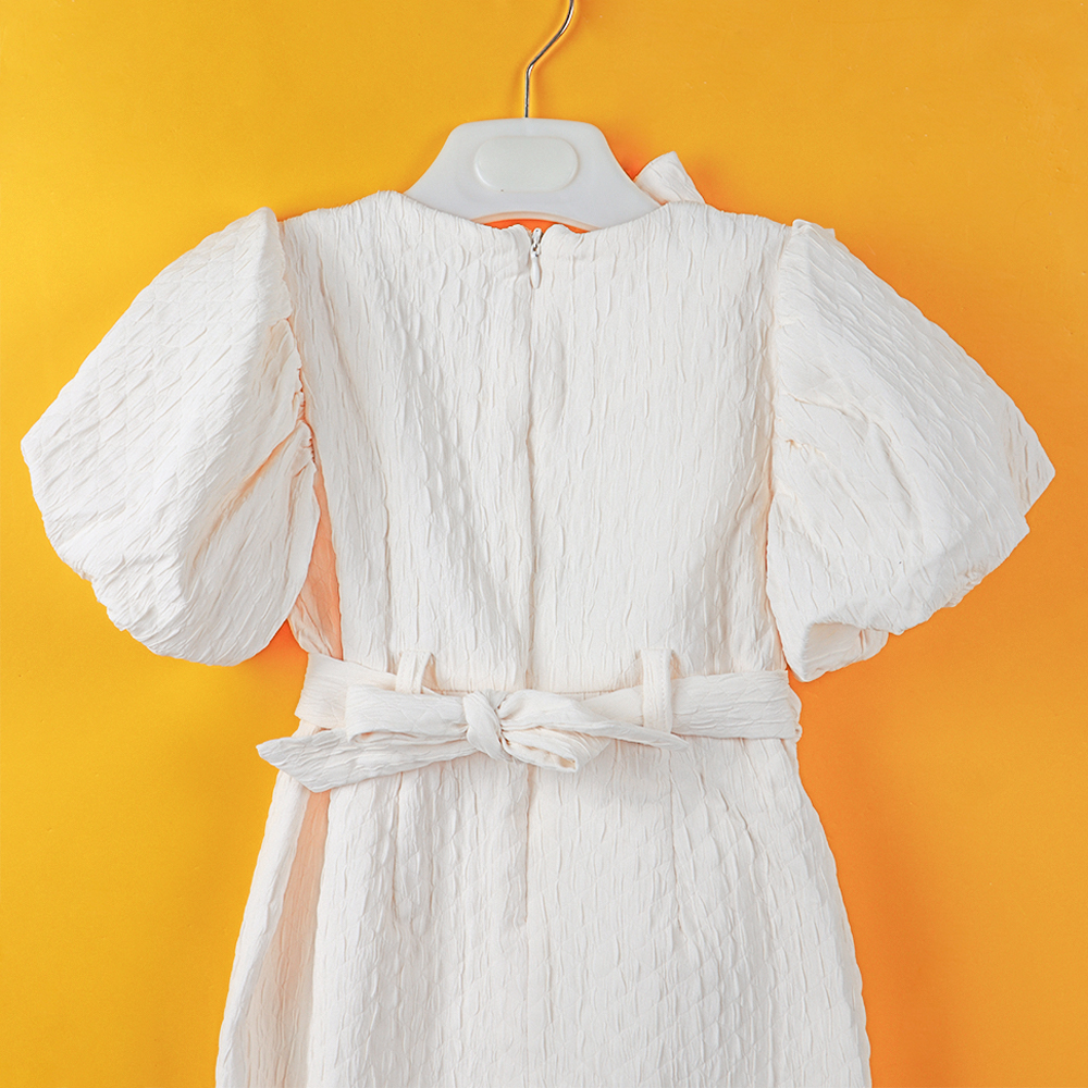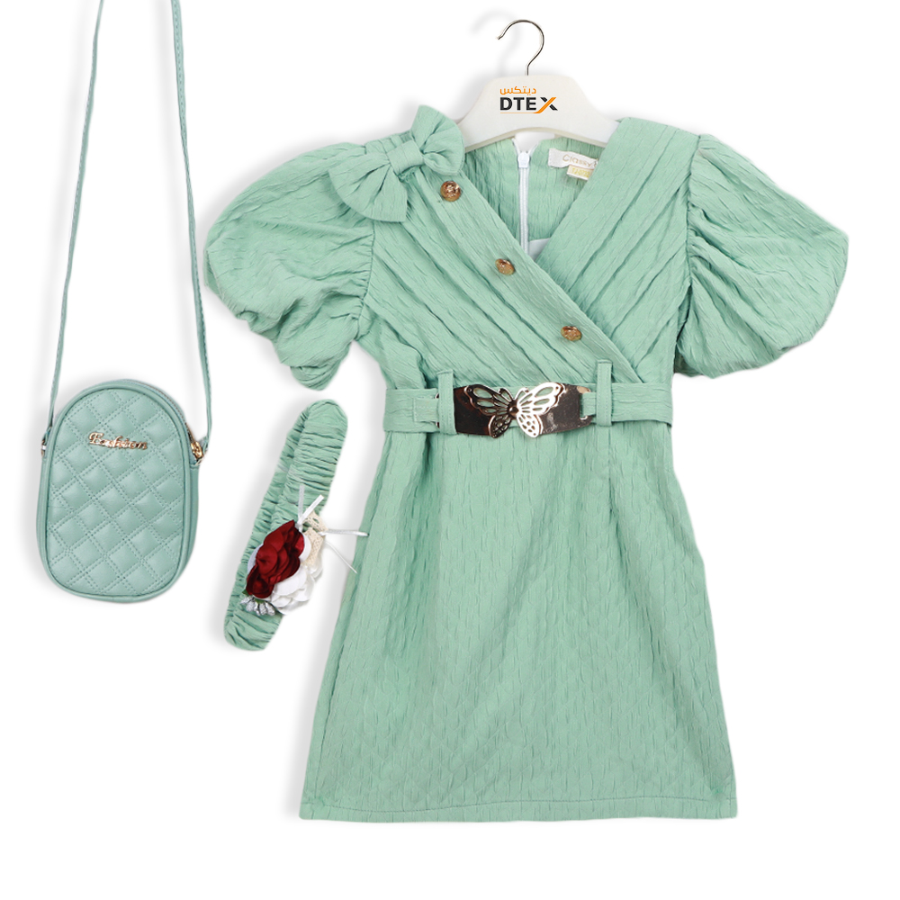 فستان بناتي أنيق يتميز بتصميم كلاسيكي راقٍ مع أكمام منفوشة قصيرة وزرّين أماميين بارزين يضفون لمسة عصرية يزين الخصر حزام أنيق مع مشبك على شكل فراشة لامعة يبرز جمال التصميم، كما يأتي معه إكسسوار متناسق ليكمل الإطلالة