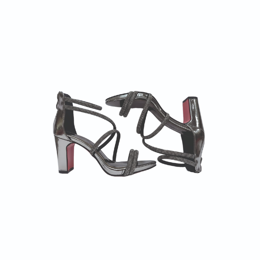 مصمم الحذاء بمجموعة من الأحزمة الرفيعة والمتصالبة أو المتوازية التي تلتف حول مقدمة القدم والكاحل. هذه الأحزمة مرصعة بالكامل بالكريستال اللامع أو أحجار الراين |