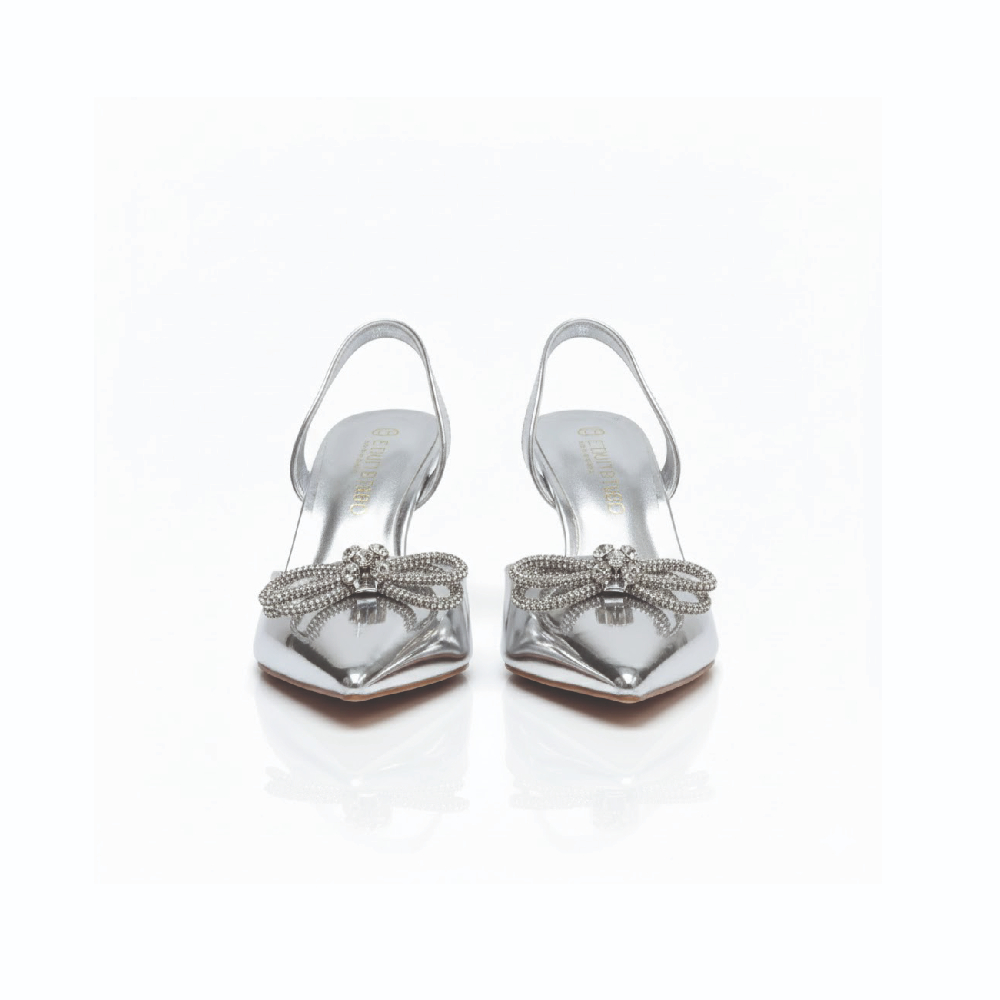 التصميم يجمع بين الكلاسيكية في الشكل العام (مقدمة مدببة وكعب أنيق) والفخامة العصرية من خلال اللمسة المعدنية اللامعة والفيونكة المرصعة بالكريستال |