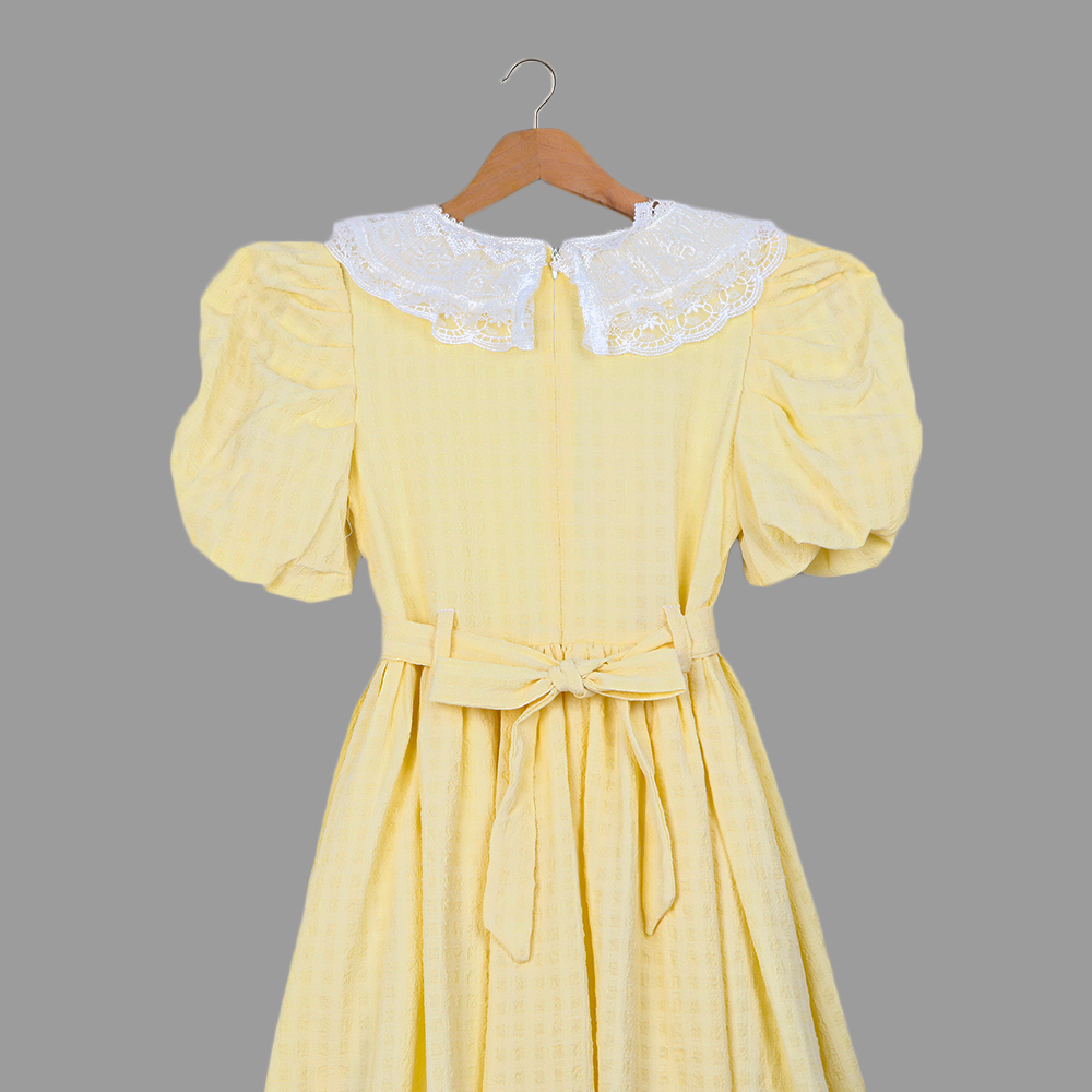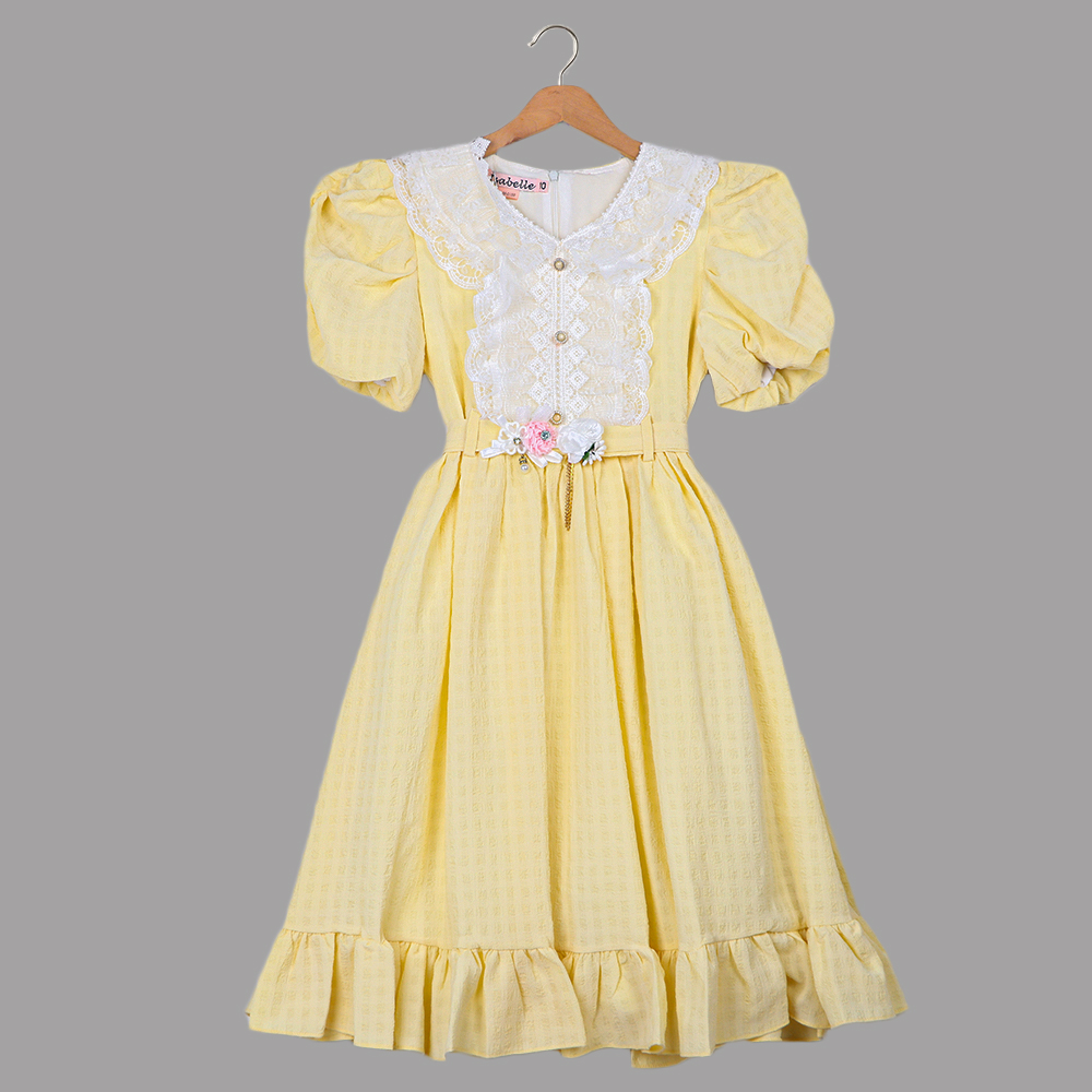 فستان أنيق يتميز بتصميم كلاسيكي راقٍ مع ياقة عريضة مزينة بدانتيل أبيض مطرّز وأزرار أمامية أنيقة يأتي بحزام خصر مزين بزهور صغيرة تضيف لمسة أنثوية ساحرة الأكمام المنتفخة بتصميمها العصري تضيف حجماً جميلاً، بينما تضيف الحافة السفلية المكشكشة مظهراً طفولياً رقيقاً يأتي الفستان مع حقيبة أنيقة مكملة لتصميمه لتمنح الطفلة إطلالة متكاملة وجذابة