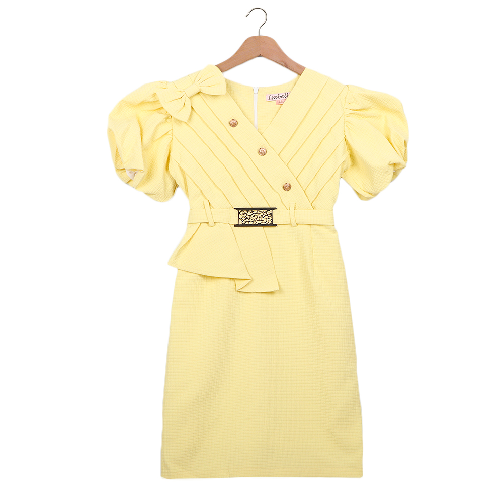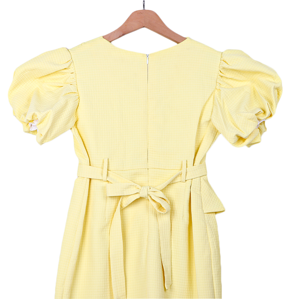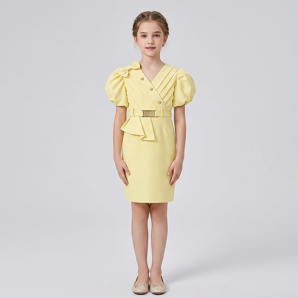 فستان بناتي بلون أصفر مشرق يمنح إحساسًا بالبهجة والنشاط تصميمه الراقي بالأكمام المنفوخة والحزام المزخرف يضيف لمسة فخمة ومميزة على الإطلالة قطعة مثالية لكل فتاة تحب التألق بإطلالة ناعمة وأنيقة في كل مناسبة
