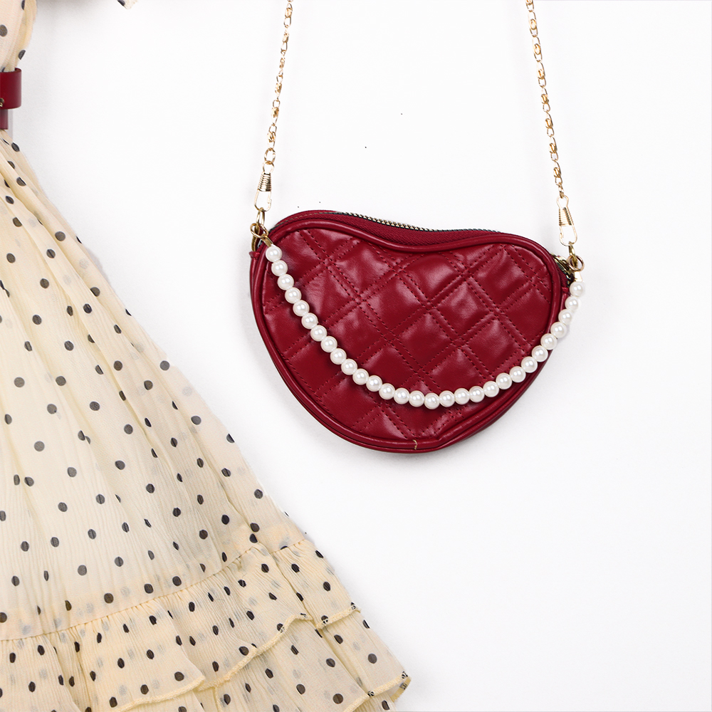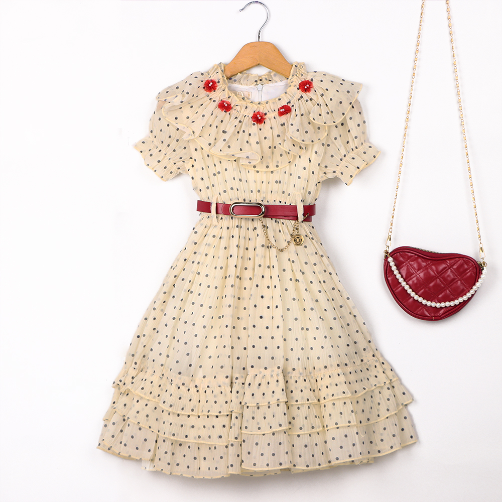فستان بناتي أنيق بتصميم منقط مزين بزهور حمراء على الياقة وكشكش ناعم يضيف لمسة أنثوية جميلة يأتي بحزام أحمر عند الخصر لإبراز القوام مع حقيبة صغيرة بنفس اللون على شكل قلب مزينة بسلسلة لؤلؤية