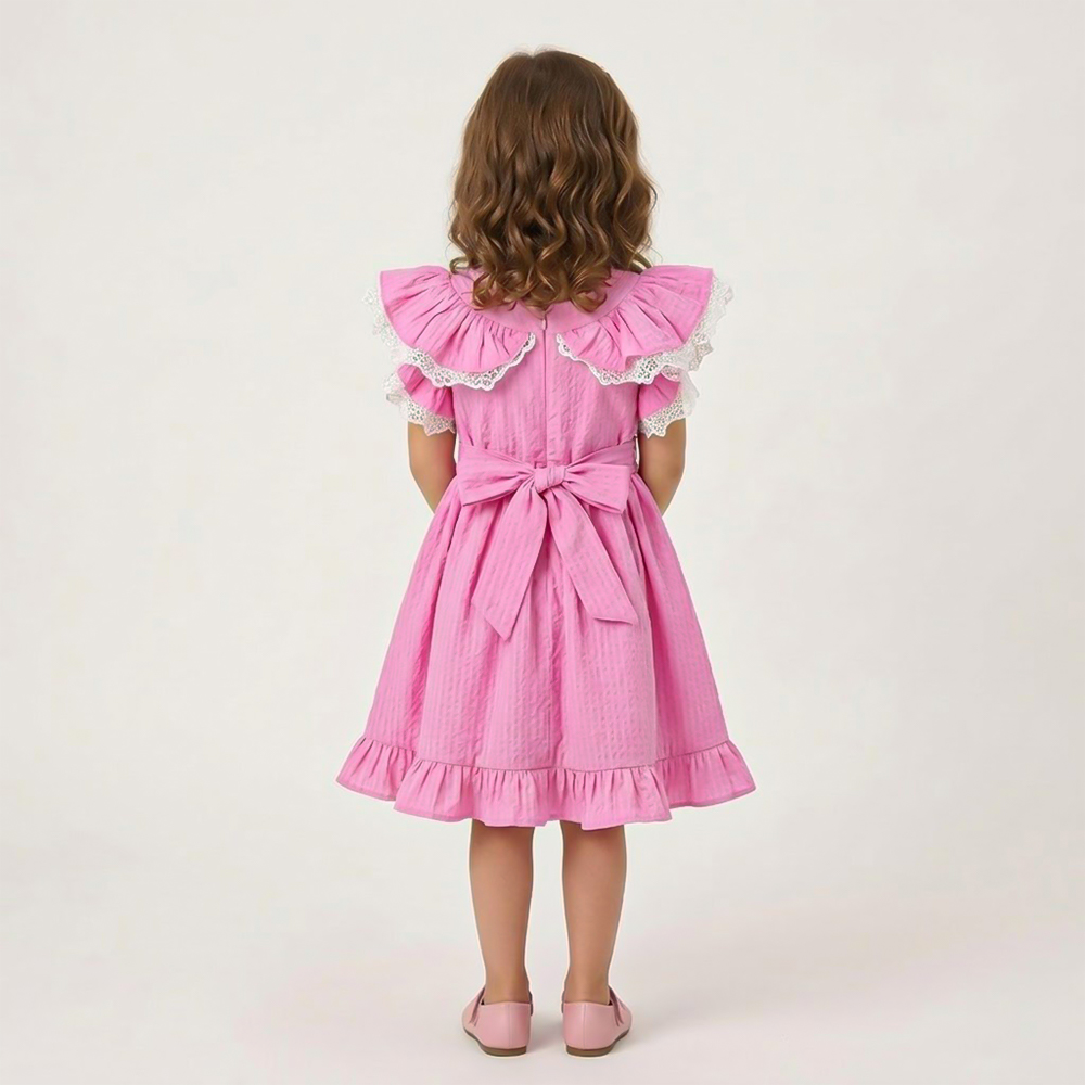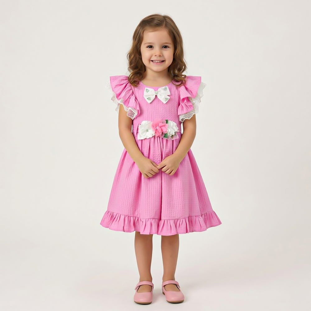 فستان أنيق باللون الوردي بتصميم منفوش مزين بالزهور والفيونكات يمنح إطلالة ناعمة للبنات الصغيرات