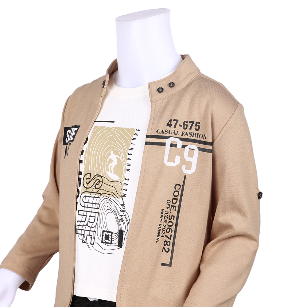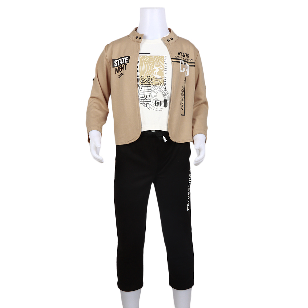 طقم ولادي عصري يتكون من ثلاث قطع متناسقة تمنح مظهرًا شبابيًا أنيقًا يشمل تيشيرت مطبوع بتصميم جذاب وجاكيت خفيف مزود بزرّين عند الياقة بتصميم مفتوح من الأمام مع بنطال بخصر مطاطي مريح وحبل شد لمزيد من الثبات يتميز الطقم بجودة خاماته وتفاصيله العصرية التي تمنح الطفل إطلالة أنيقة ومريحة في الوقت نفسه