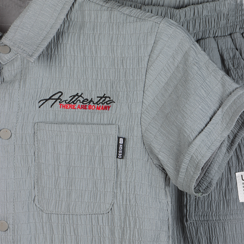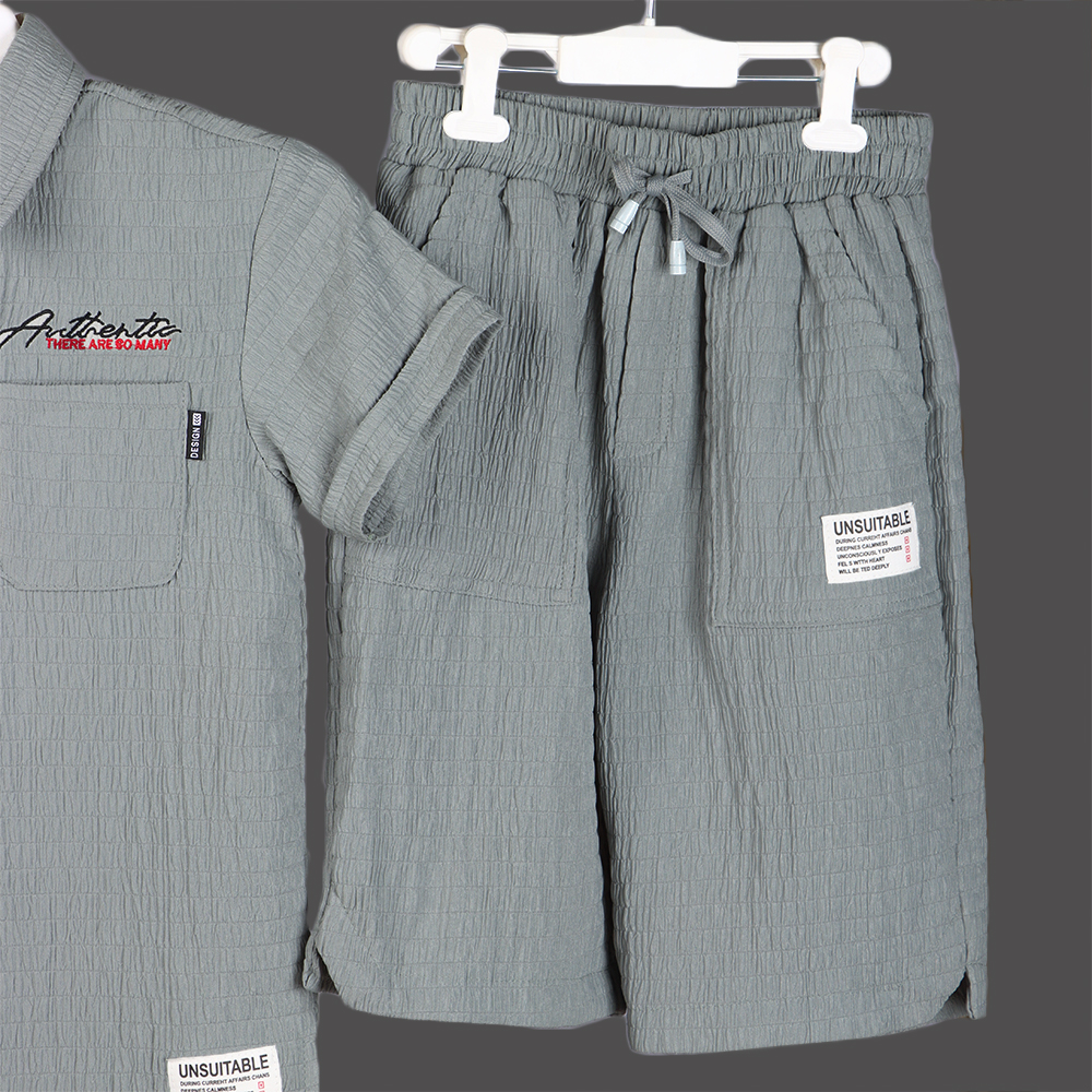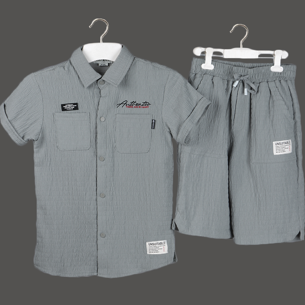 طقم ولادي أنيق بتصميم عصري ومريح يتكون من قميص نص كم مع أزرار أمامية وجيبين على الصدر يضيفان لمسة عملية مميزة ومطبوع عليه عبارات شبابية تضيف لمسة عصرية يأتي معه بنطلون قصير بنفس اللون بتصميم مريح بخصر مطاطي وخيوط شد لضبط المقاس مع جيوب جانبية عملية تمنح راحة أثناء الحركة
