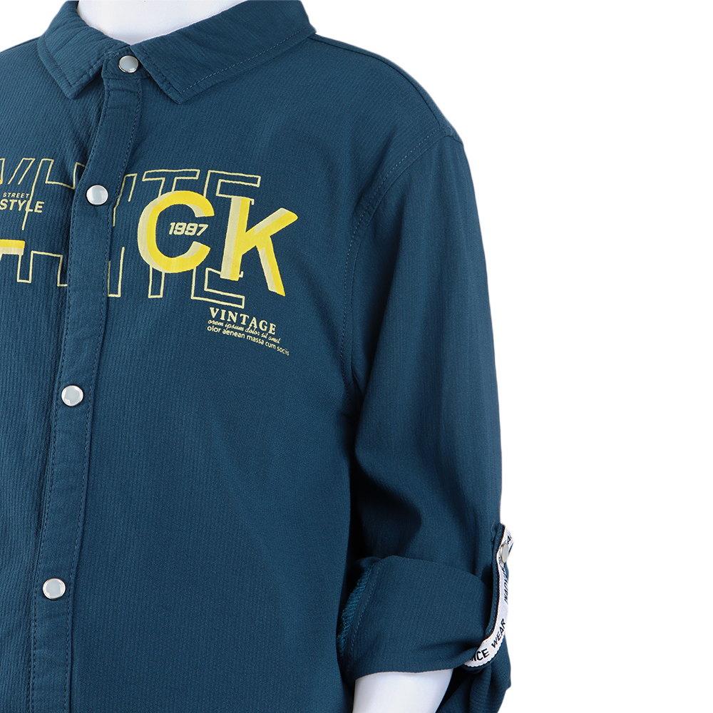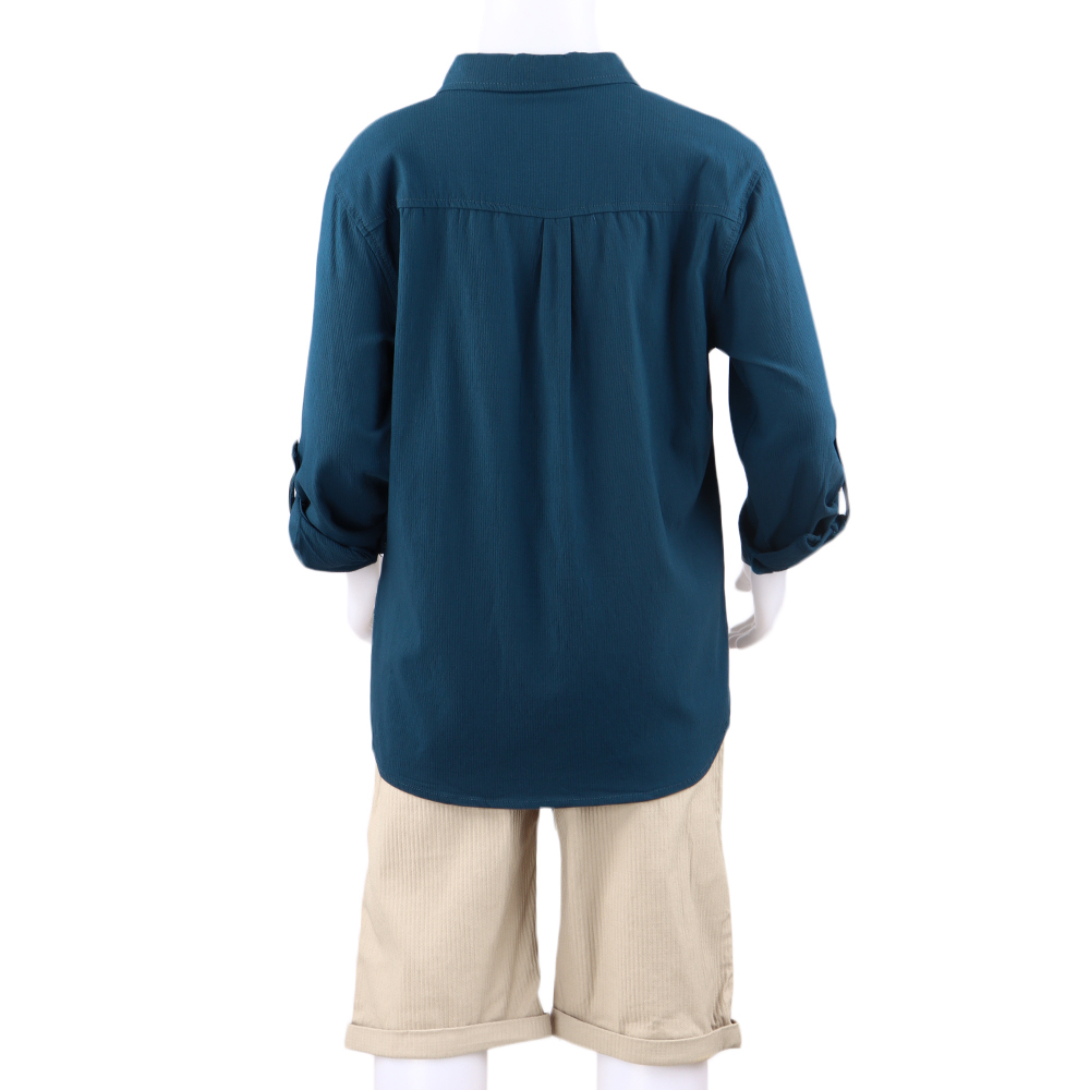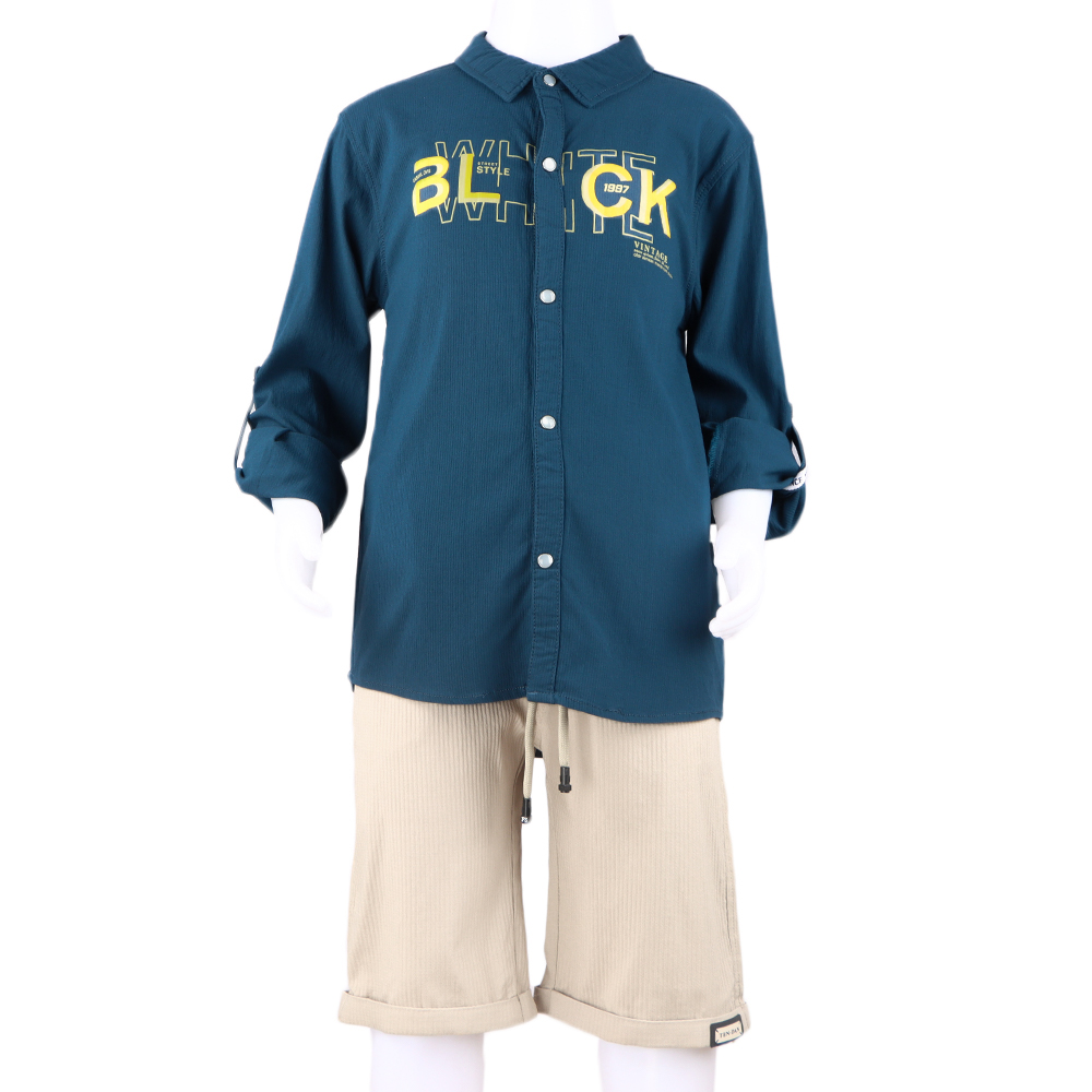 طقم ولادي أنيق يجمع بين البساطة والستايل العصري يتكون من قميص بأكمام طويلة مزين بطباعة عصرية في الأمام مع إمكانية طي الأكمام وتثبيتها بأزرار جانبية لسهولة التبديل بين الإطلالات يأتي معه بنطلون قصير بتصميم مريح وخفيف مزود بخيوط شد على الخصر لمقاس مرن ومناسب للحركة اليومية