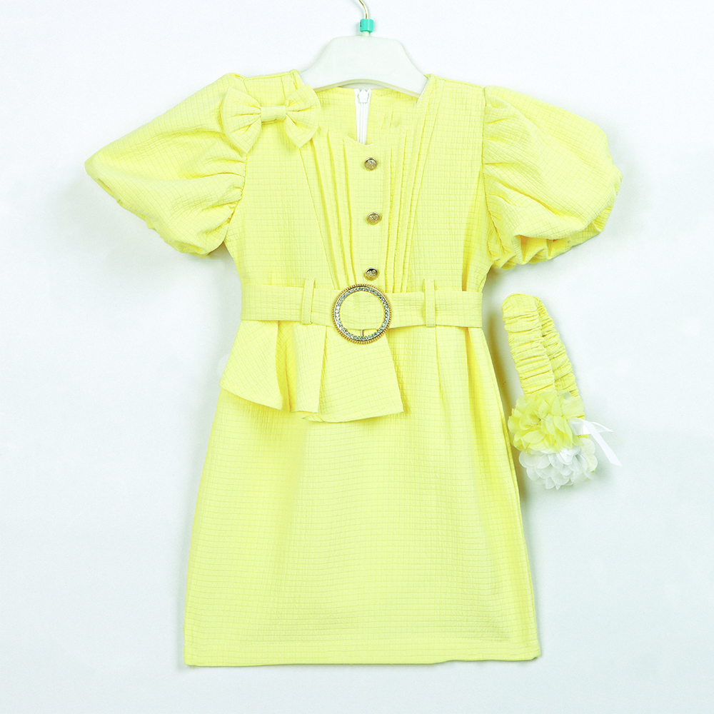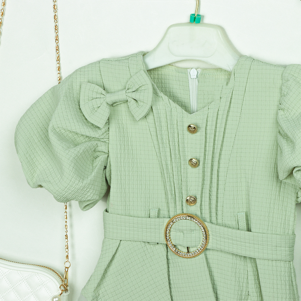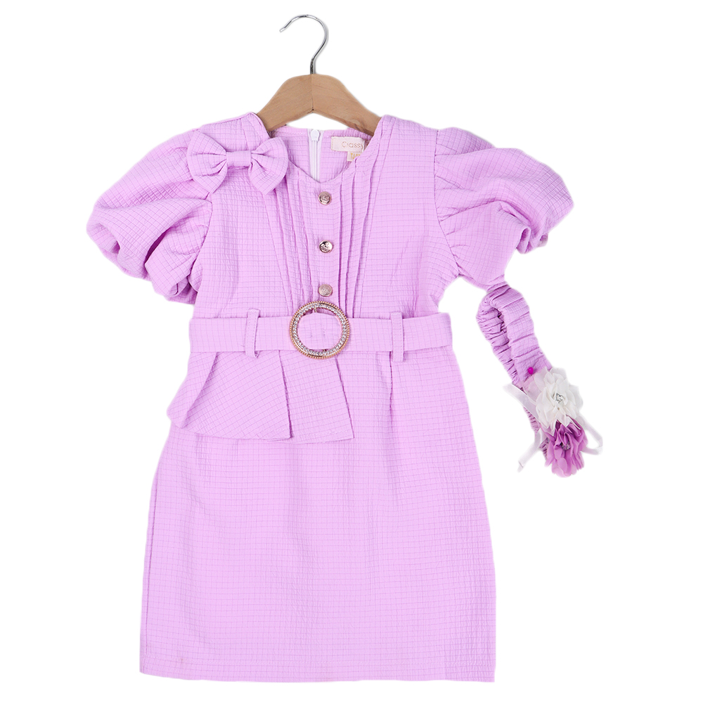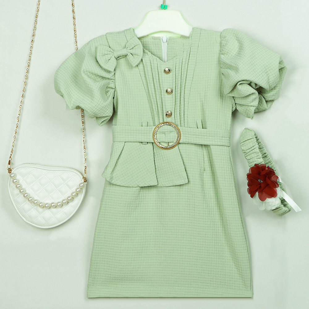 فستان بناتي راقٍ يتميز بتصميم أنثوي ناعم يجمع بين البساطة والفخامة يأتي بأكمام منفوخة تضيف لمسة مميزة مع ياقة صغيرة وعقدة جانبية أنيقة وأزرار أمامية ذهبية تضيف لمسة راقية مزود بحزام بنفس اللون مع إبزيم دائري مرصع بالكريستال لإبراز الخصر وإكمال الإطلالة بأسلوب أنثوي جذاب بالإضافة إلى رباط مزين بورود