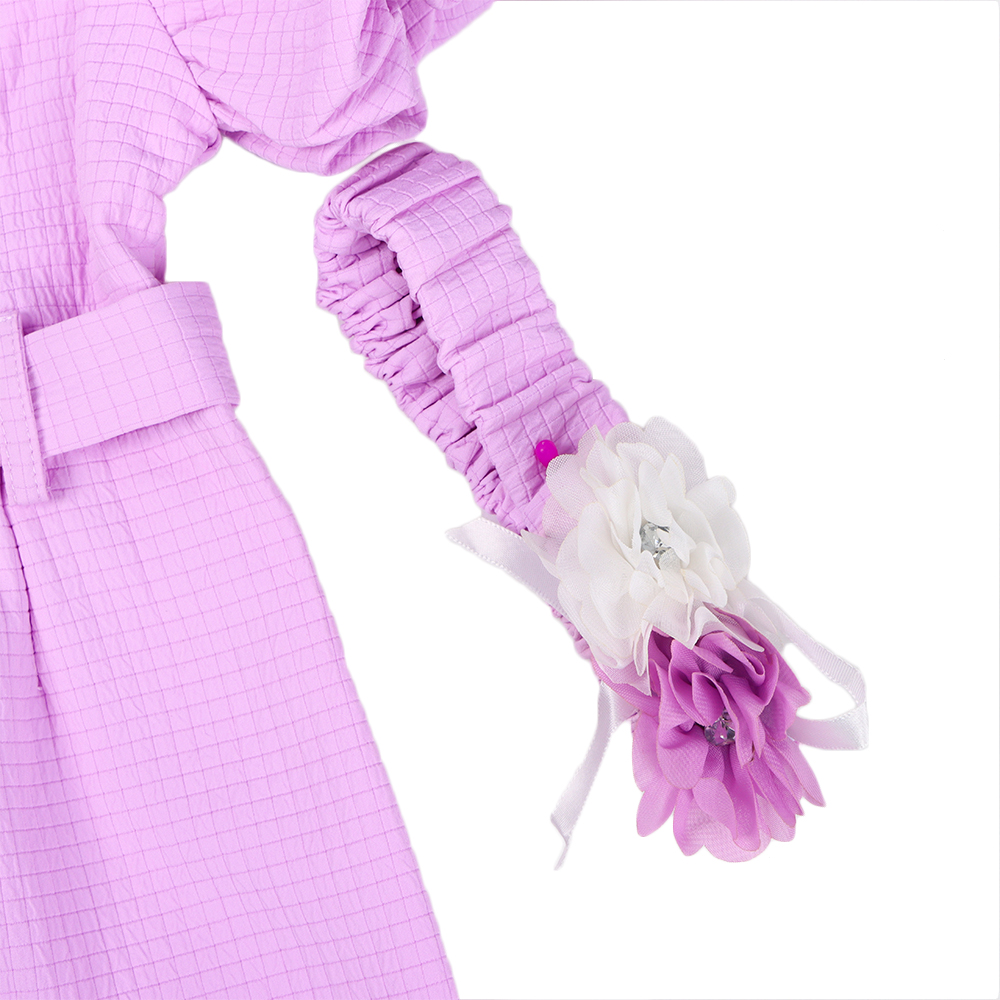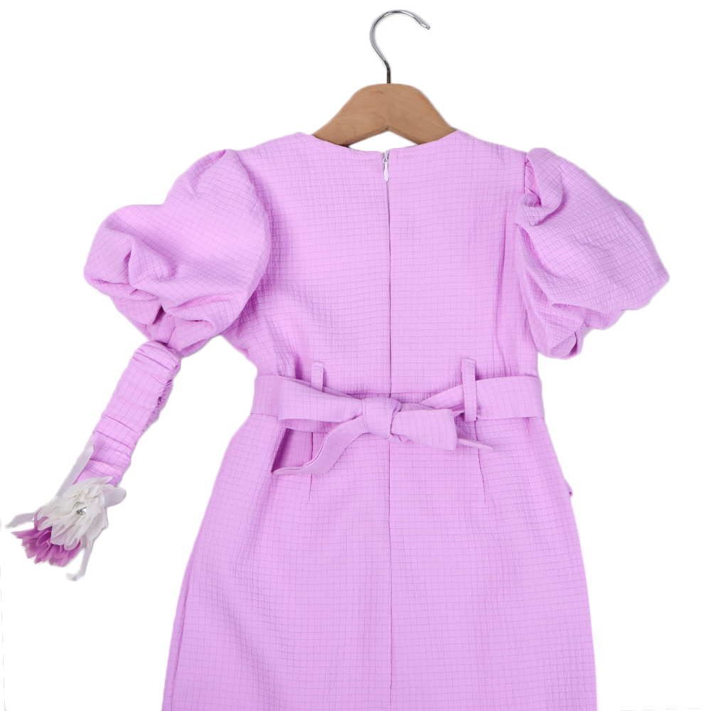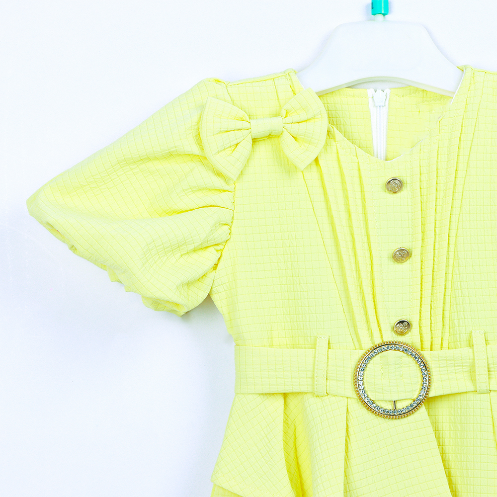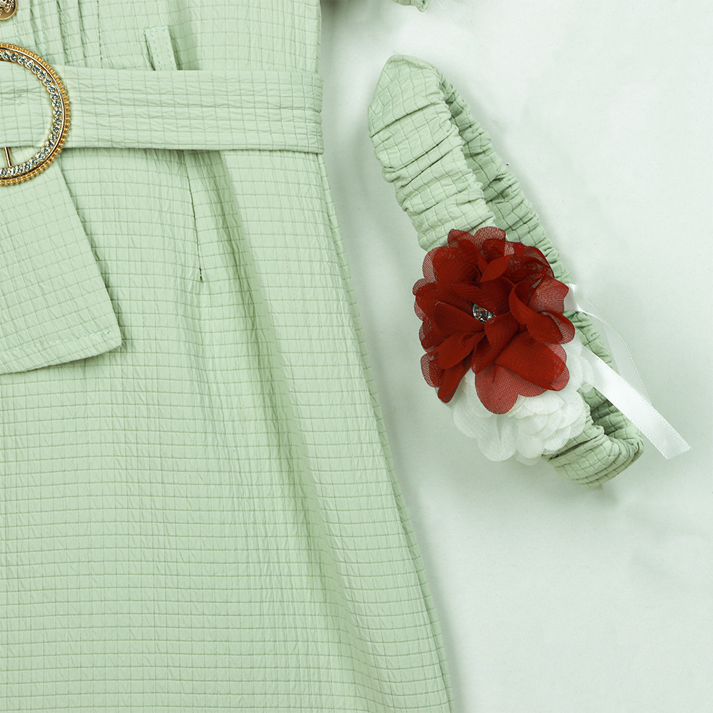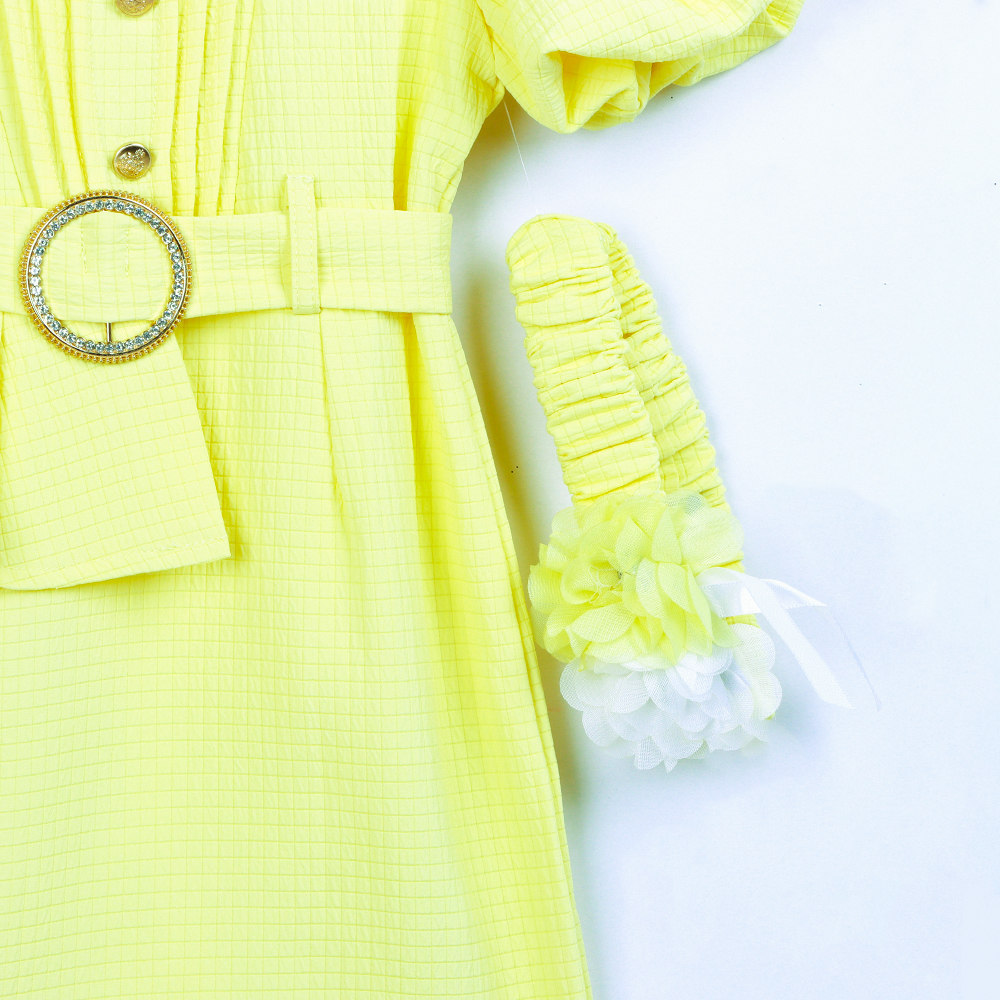 فستان بناتي راقٍ يتميز بتصميم أنثوي ناعم يجمع بين البساطة والفخامة يأتي بأكمام منفوخة تضيف لمسة مميزة مع ياقة صغيرة وعقدة جانبية أنيقة وأزرار أمامية ذهبية تضيف لمسة راقية مزود بحزام بنفس اللون مع إبزيم دائري مرصع بالكريستال لإبراز الخصر وإكمال الإطلالة بأسلوب أنثوي جذاب بالإضافة إلى رباط مزين بورود