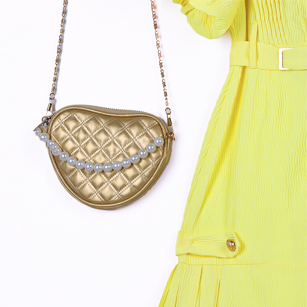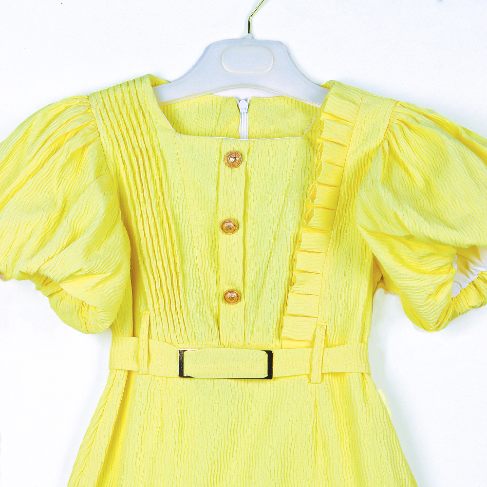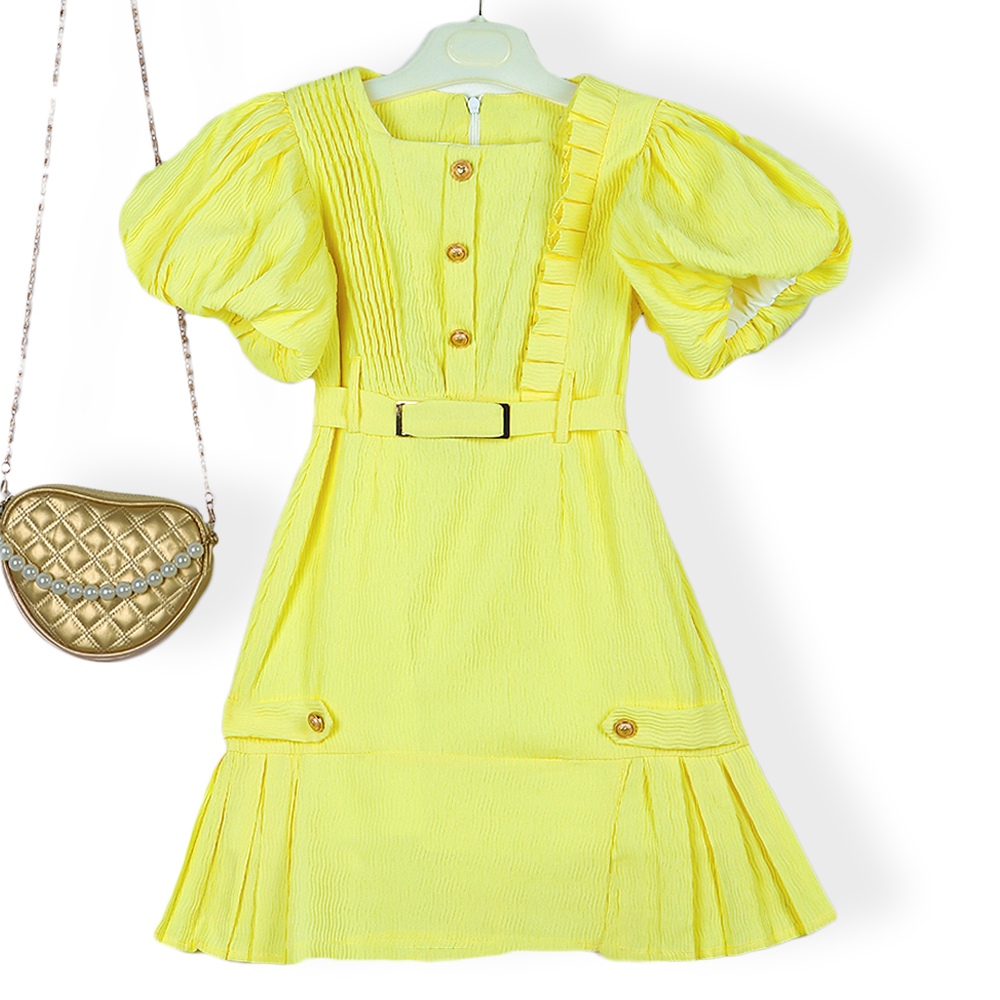 فستان بناتي ناعم بتصميم راقٍ يجمع بين البساطة والأناقة يتميز بأكمام منفوخة تضيف لمسة أنثوية مميزة وتفاصيل كشكش عمودية على الصدر تمنحه مظهراً أنيقاً مزود بحزام بنفس اللون يبرز الخصر وأزرار أمامية تضيف لمسة كلاسيكية جميلة يأتي مع حقيبة صغيرة بتصميم نصف قلب مزينة بسلسلة من اللؤلؤ لمظهر متكامل وراقي