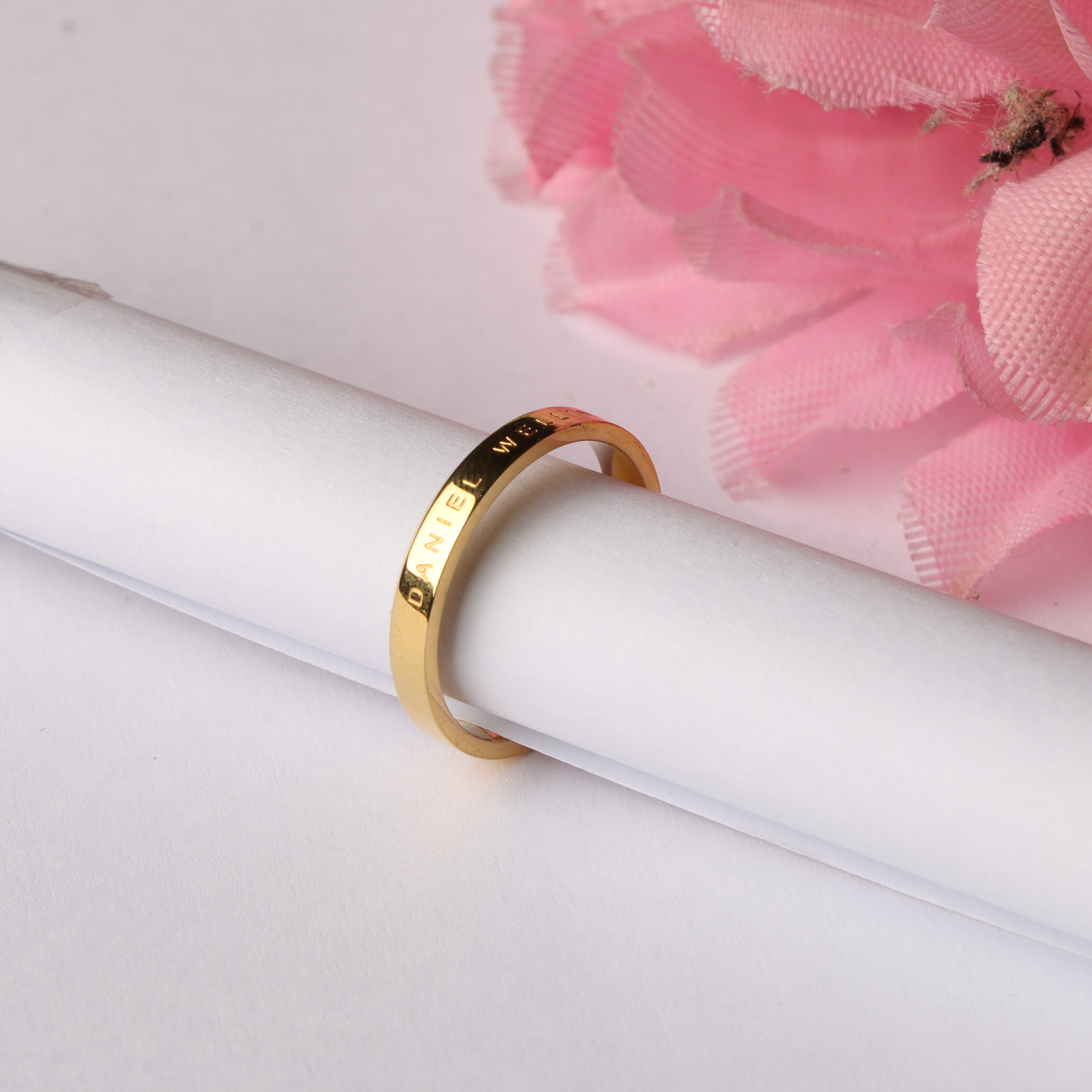 خاتم بسيط وأنيق مصنوع من ستانلس ستيل مطلي باللون الذهبي اللامع يتميز بخفة وزنه ولمعانه الواضح يحمل نقشًا حرفيًا دقيقًا على السطح الخارجي يمنحه لمسة عصرية وفريدة