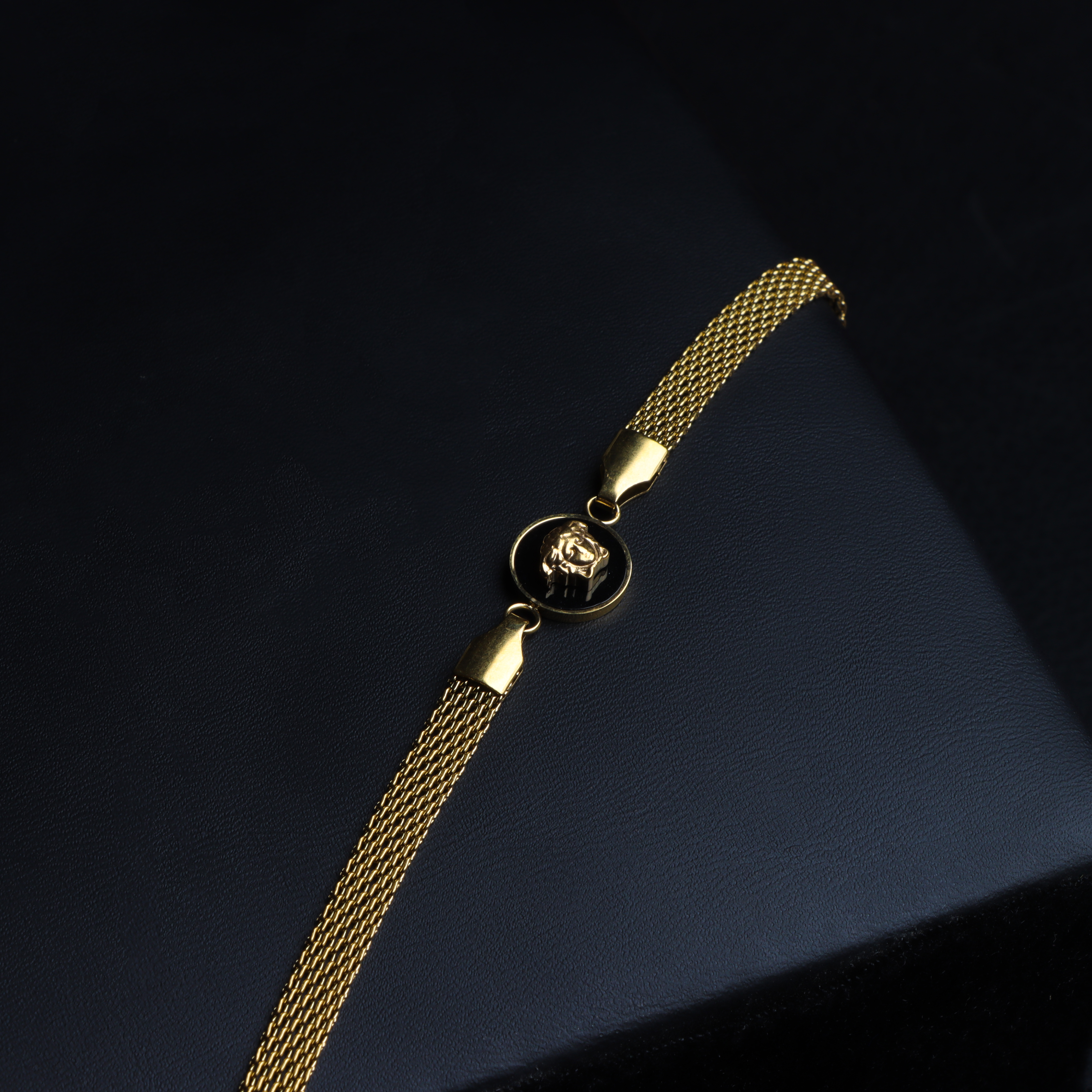 سوار فاخر بتصميم شبكي ناعم يجمع بين الأناقة والبساطة يتوسطه رمز محفور على شكل رأس منحوت يمنح القطعة طابعًا راقيًا وجريئًا مصنوع بلون ذهبي لامع يضيف لمسة فاخرة لأي إطلالة ويظهر جمال المعصم بأسلوب عصري وراقي