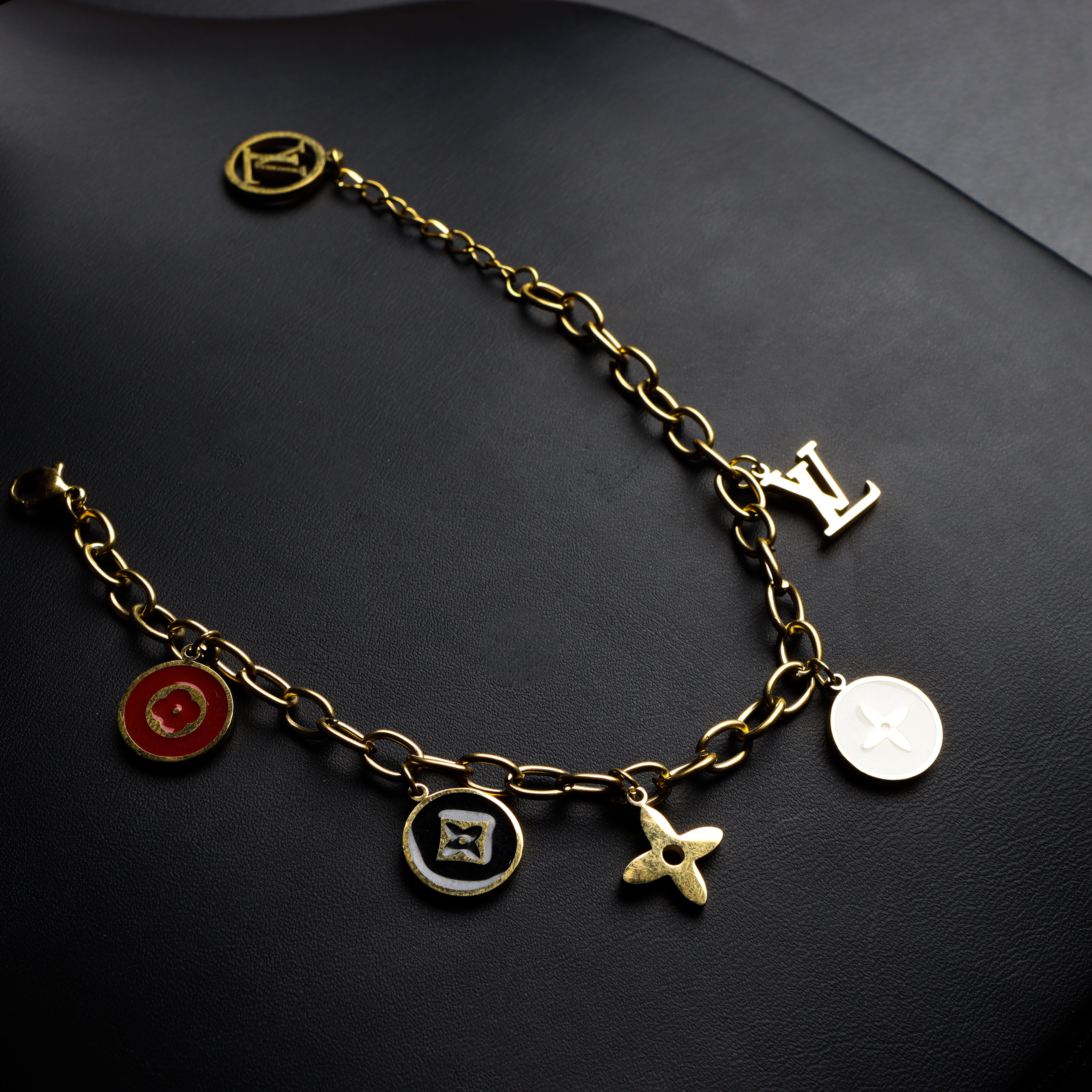 سلسلة معدنية ذهبية بخطافات صغيرة متينة مجموعة تشارمز متنوعة تشمل: دوائر مزينة بالمينا الملون (أحمر، أسود، أبيض) زخرفة وردة رباعية (فلاور أيقونية) قطعة معدنية على شكل الحرف L بحجم بارز تنسيق جميل بين الألوان المعدنية واللمسات اللامعة تصميم خفيف ومرن يمنح حرية حركة ناعمة وجذابة قفل قابل للتعديل مناسب لمختلف المقاسات |
