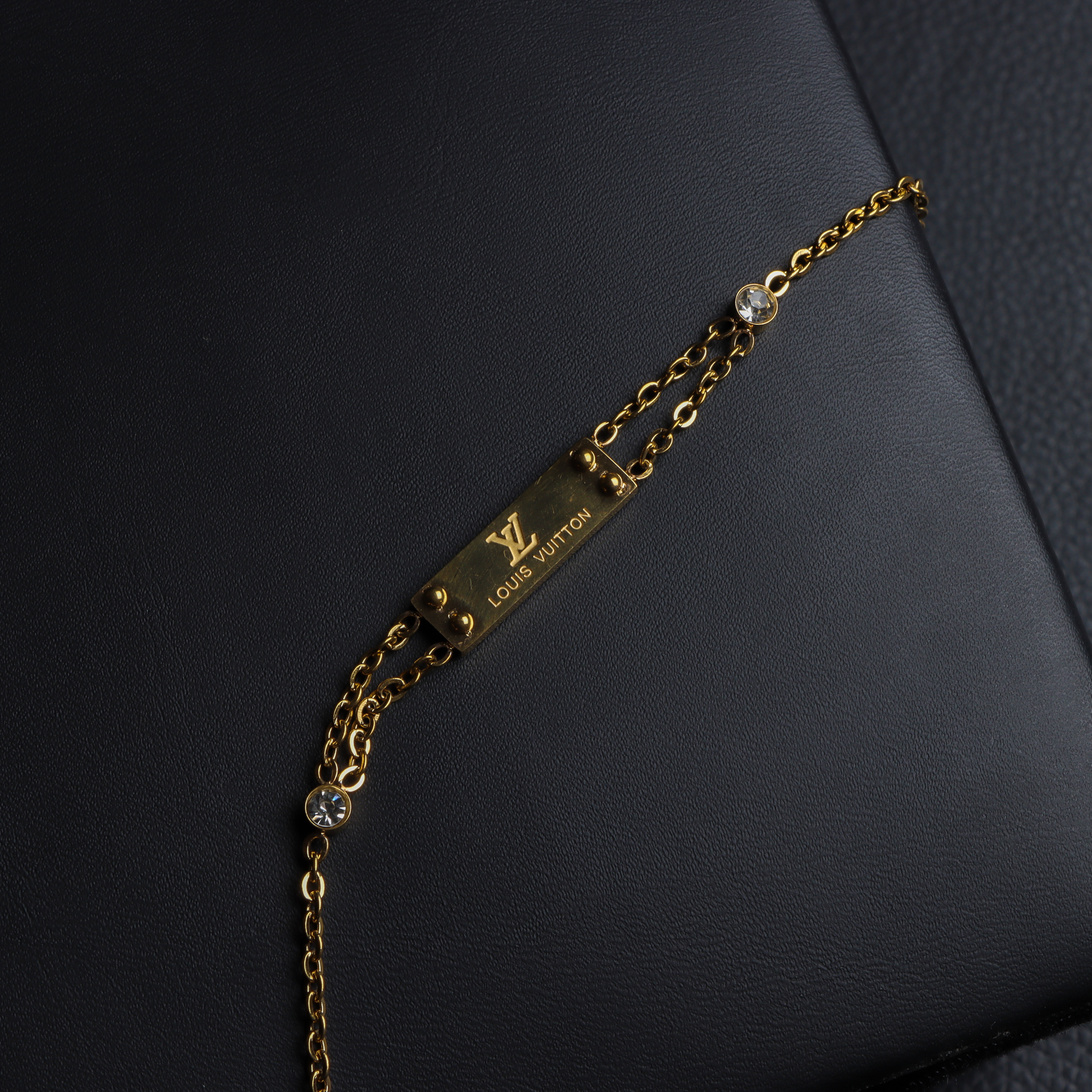 سوار فاخر بتصميم كلاسيكي راقٍ يأتي بسلسلة ذهبية رفيعة تتوسطها قطعة معدنية مستطيلة تحمل نقشًا أنيقًا بالإضافة إلى لمسات لامعة من أحجار كريستالية تضيف لمسة فخامة