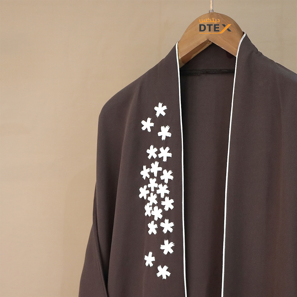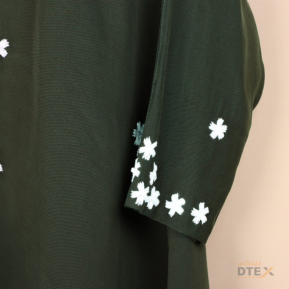 تصميم فضفاض عصري مزين بزهور بيضاء مطرزة على الأكمام والصدر مع حواف بلون أبيض لمزيد من التناسق والأناقة |