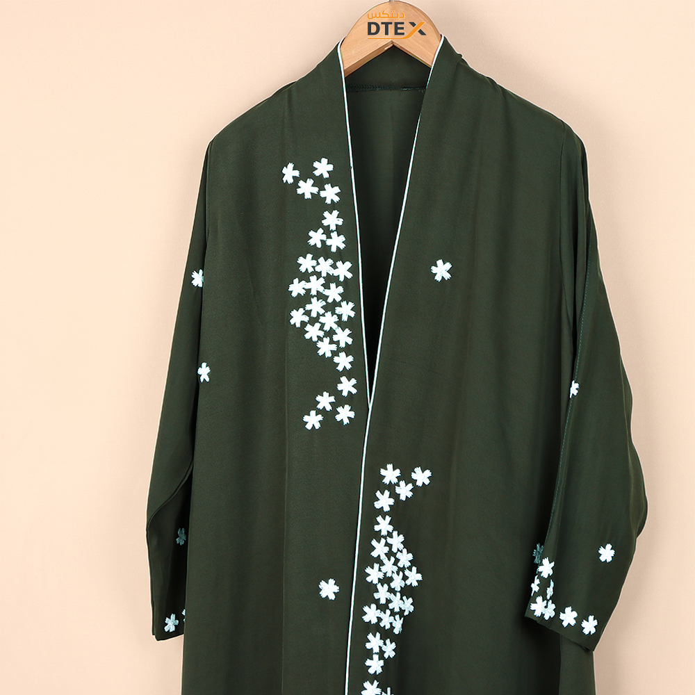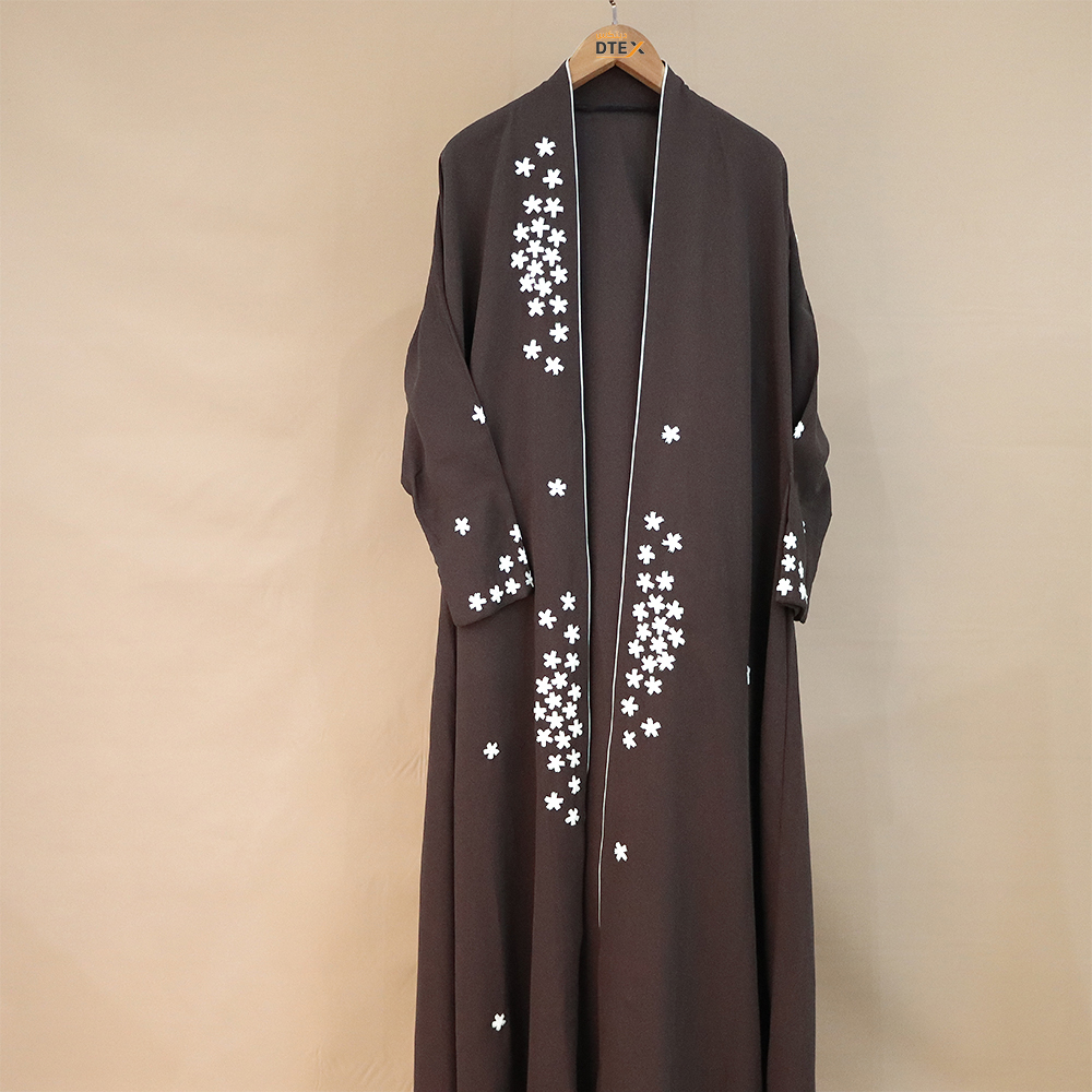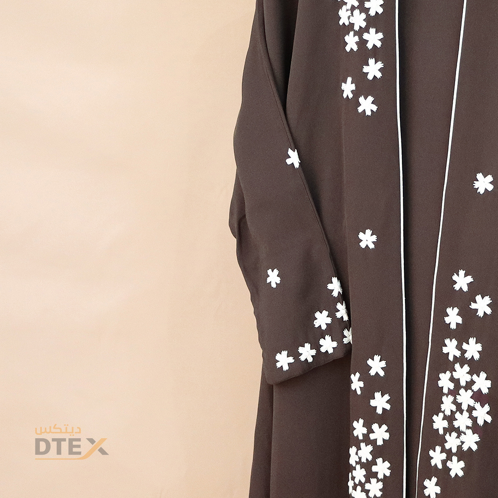 عباية أنيقة مزينة بتطريز ناعم على شكل زهور بيضاء متناثرة تضيف لمسة من النعومة والأنوثة