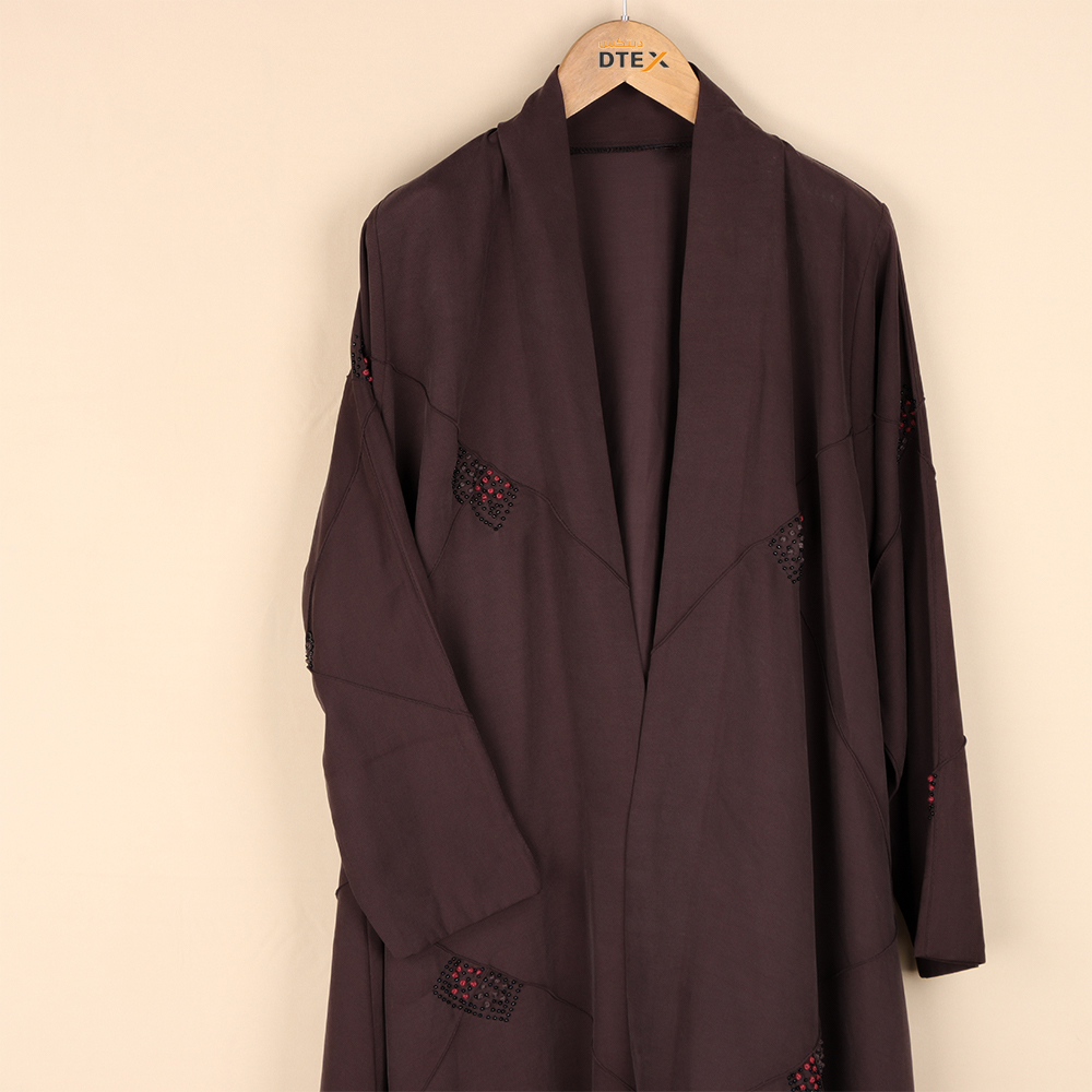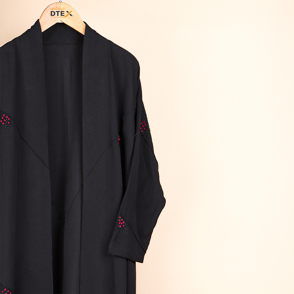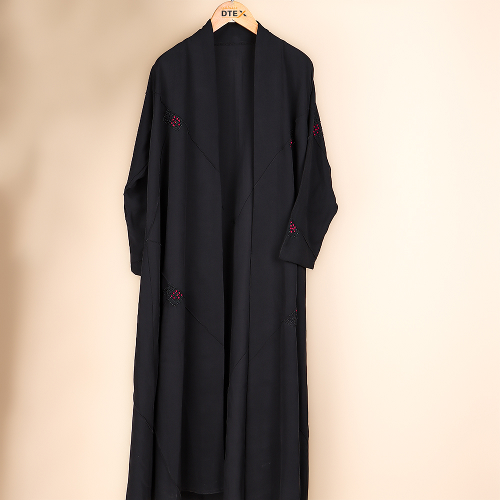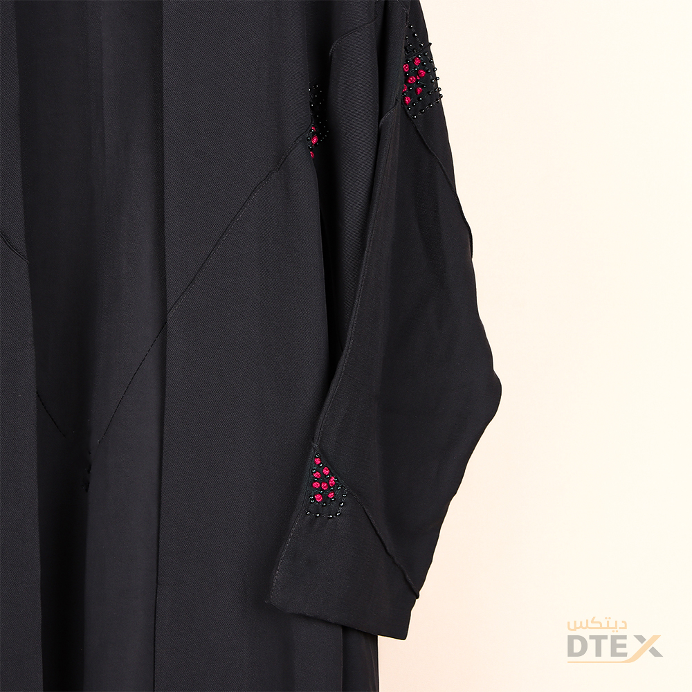 تصميم مفتوح من الأمام بدون أزرار يتميز بتفاصيل تطريز دقيقة على الأكمام والجانبين باللونين الأسود والأحمر مع قصات هندسية تمنح العباية مظهراً عصرياً ومتقناً الأكمام الواسعة تضيف لمسة من الانسيابية والراحة |