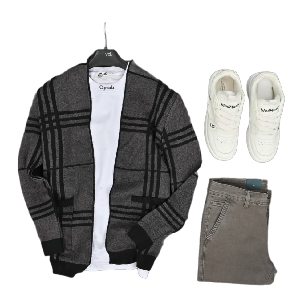 هذا الطقم المنسق بالكامل يضمن لك إطلالة جذابة ومهندمة ومثالي لأيام الخريف والشتاء الباردة حيث يتكون من جاكيت مفتوح بتصميم كاروهات حيث ان تصميم المربعات (كاروهات) كبيرة باللونين الرمادي الفحمي والأسود ومفتوح من الأمام (دون سحاب أو أزرار) يضفي لمسة عصرية ومرونة في التنسيق وخامة الجاكيت نسيج صوفي فاخر، ثقيل ومحبوك بإتقان لدفء مثالي ويأتي معه تيشيرت أبيض ناصع بياقة مستديرة، يعمل كقاعدة مثالية لتباين الألوان الداكنة مع بنطلون أنيق بلون رمادي وبقصة مستقيمة ومريحة، سهلة التنسيق مع جميع الألوان