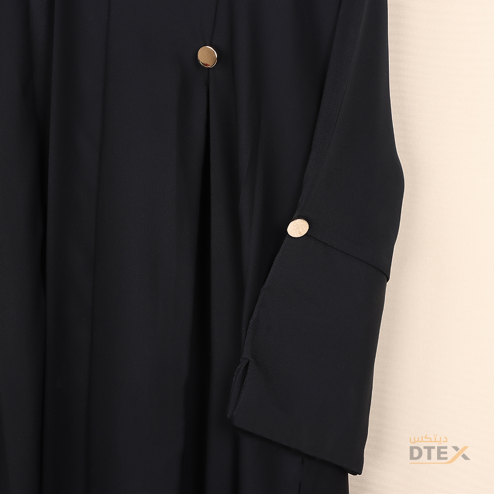 تصميم أمامي بسيط بياقة على شكل V وأكمام متوسطة الطول مزينة بأزرار ذهبية أنيقة مع قصات طولية تمنح العباية مظهراً انسيابياً يعزز من الرشاقة والأناقة |