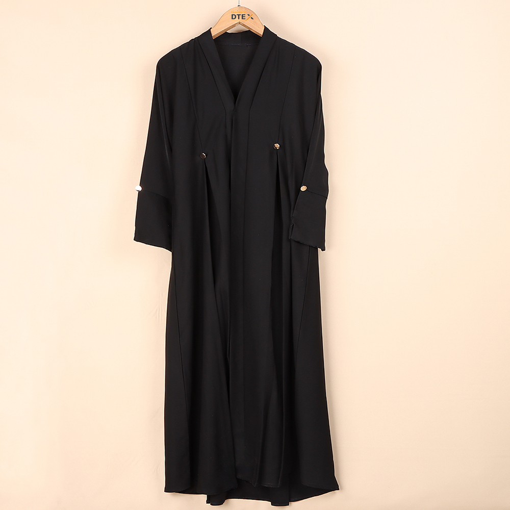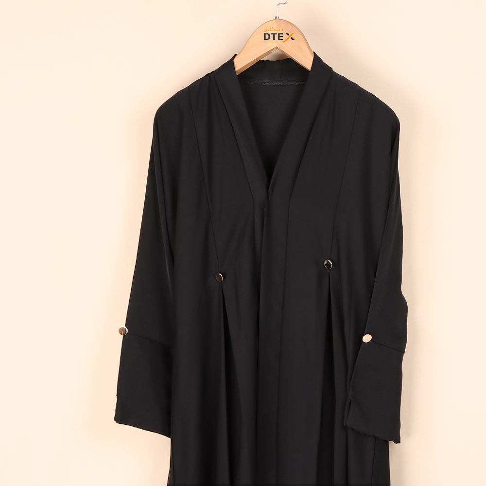 عباية أنيقة تجمع بين البساطة والفخامة بتصميم انسيابي باللون الأسود الكلاسيكي مع تفاصيل أزرار ذهبية تضيف لمسة من الجاذبية والرقي تمنح إطلالة محتشمة ومميزة مناسبة لمختلف المناسبات