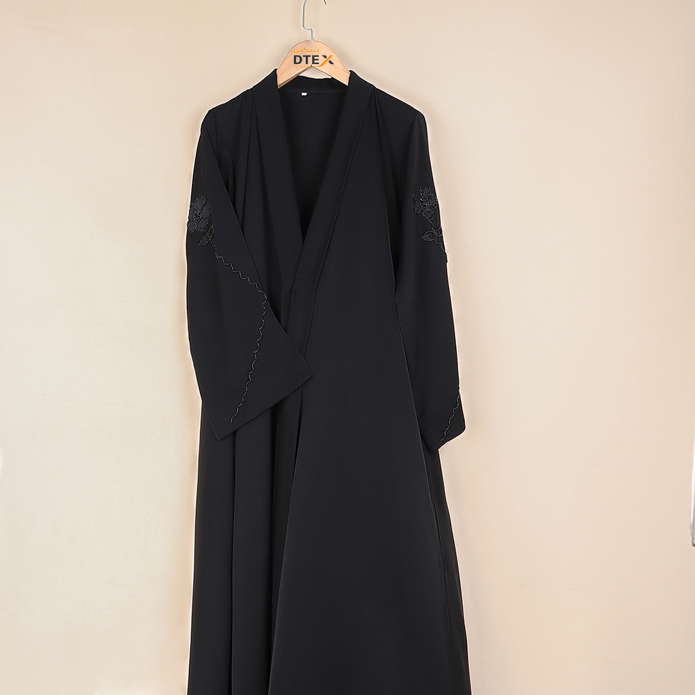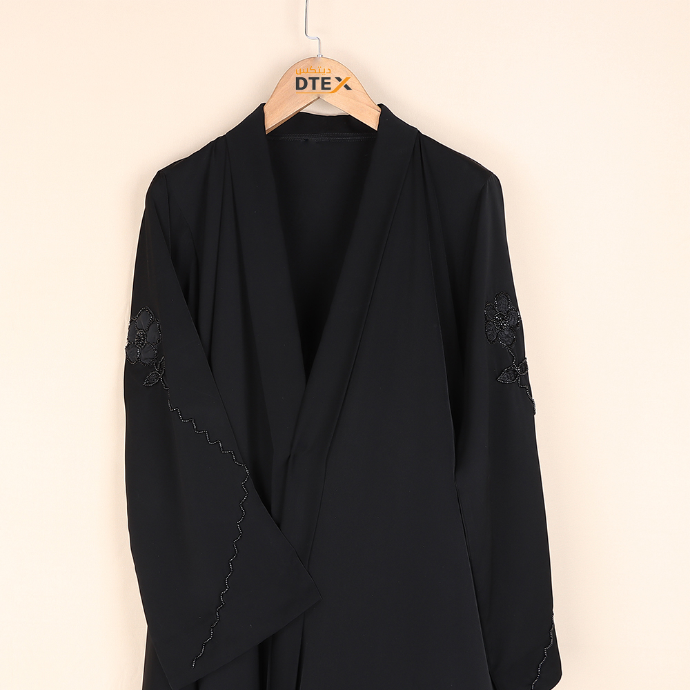 عباية راقية باللون الأسود بتصميم انسيابي بسيط، مزينة بتطريزات يدوية على الأكمام بشكل زهور أنثوية بخيوط وخرز لامع