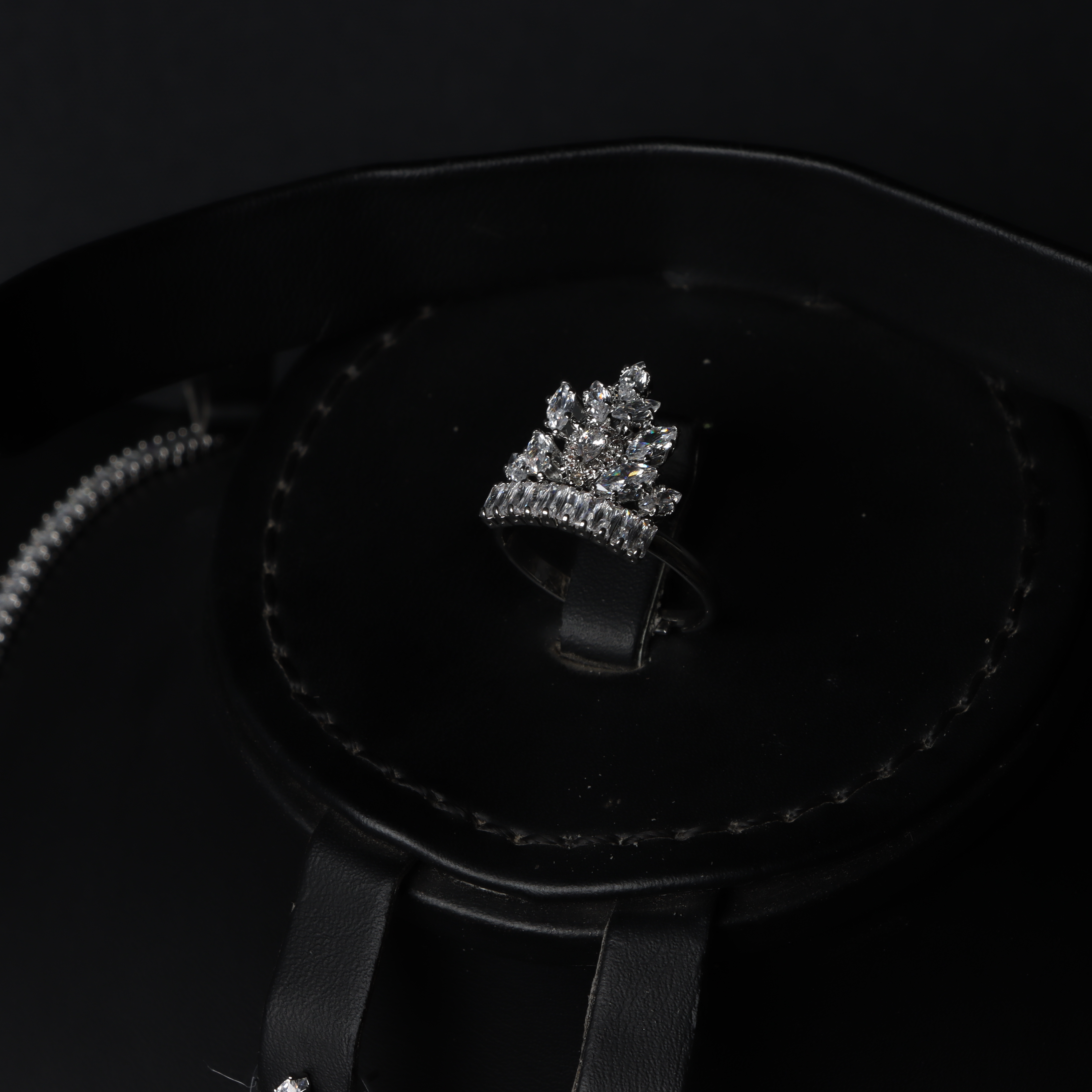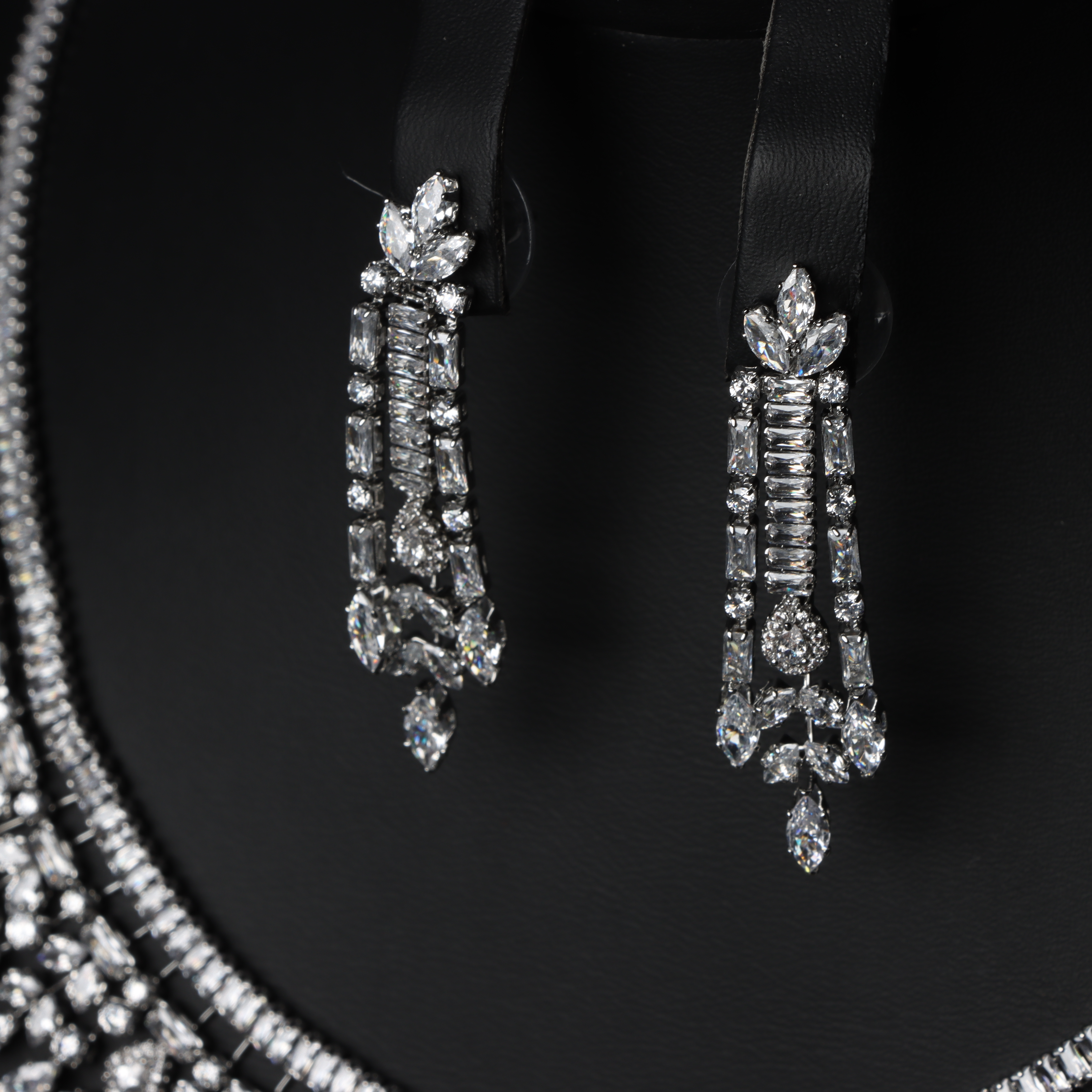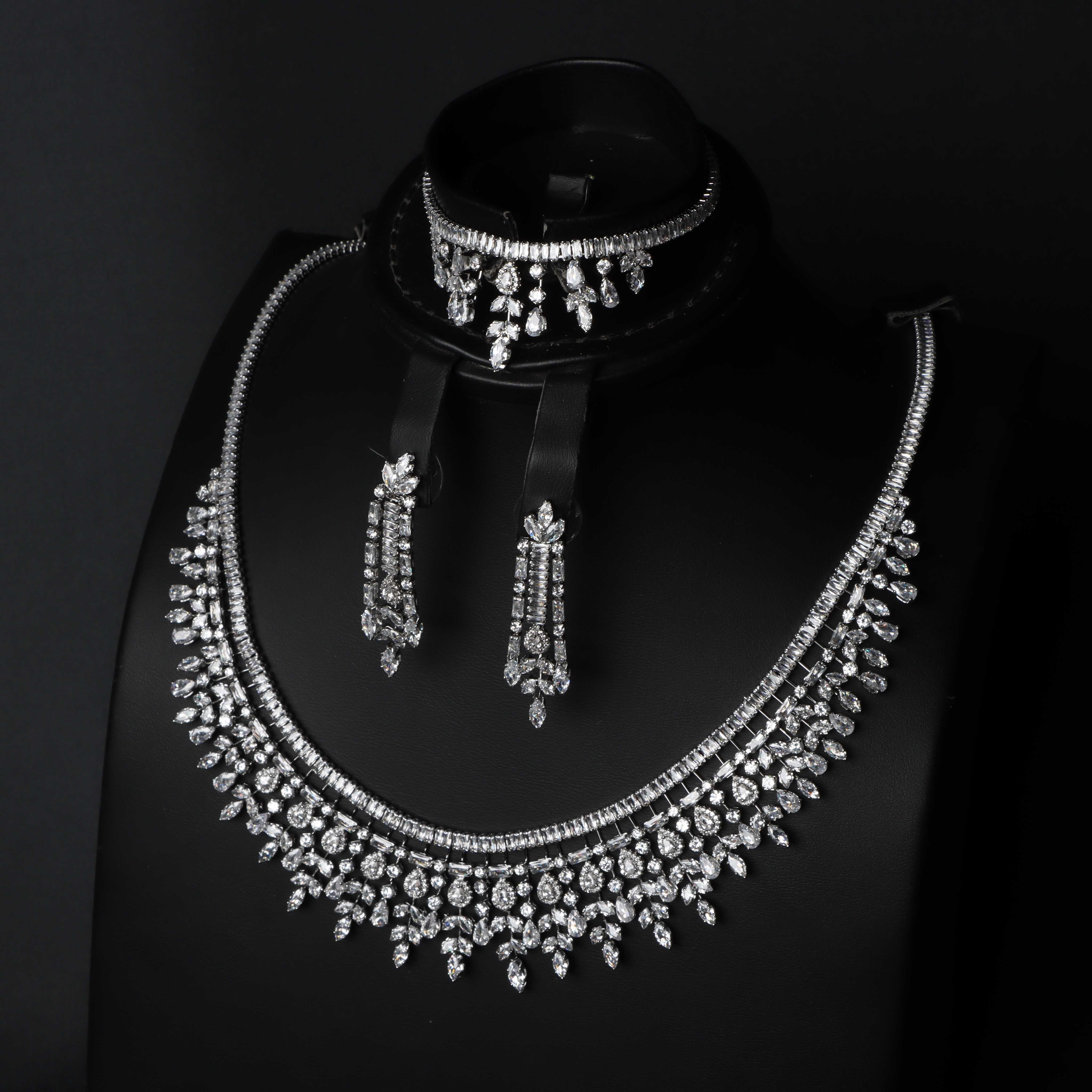 طقم راقٍ بتصميم فاخر يعكس فخامة المجوهرات الكلاسيكية اللامعة يتميز بترصيع كثيف من أحجار الزركون البراقة التي تمنح لمعانًا قويًا وتبرز جمال الإطلالة في المناسبات الطقم مصمم بعناية ليمنحك حضورًا مميزًا وأناقة لافتة