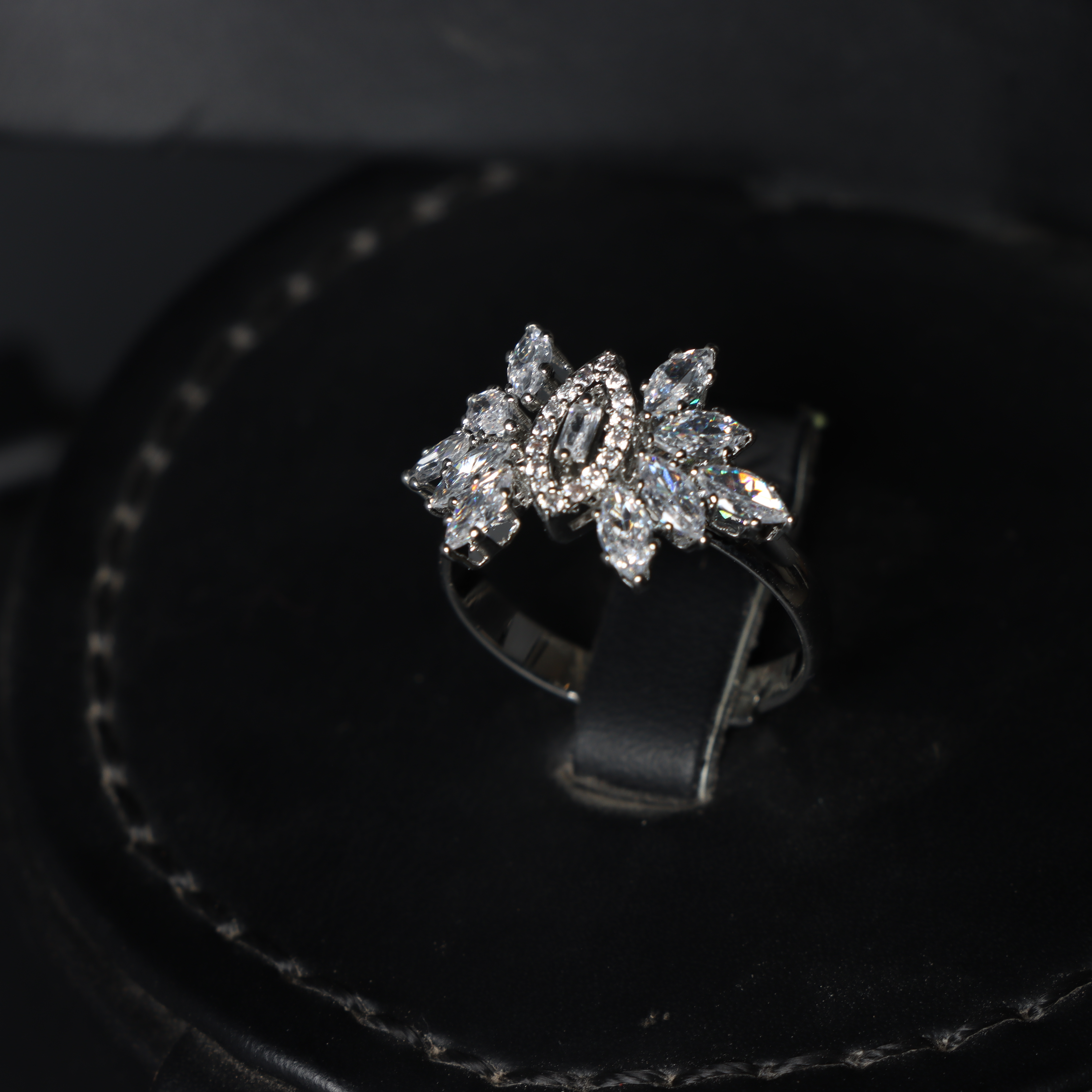 عقد أنيق مرصّع بزركون ماركيز متناسق مع حبات متدلية، وأقراط مطابقة تمنح بريقًا مضاعفًا، مع اسوارة رفيعة مرصّعة بالكامل، إضافة إلى خاتم فخم يكمل الطقم بتناغم راقٍ |