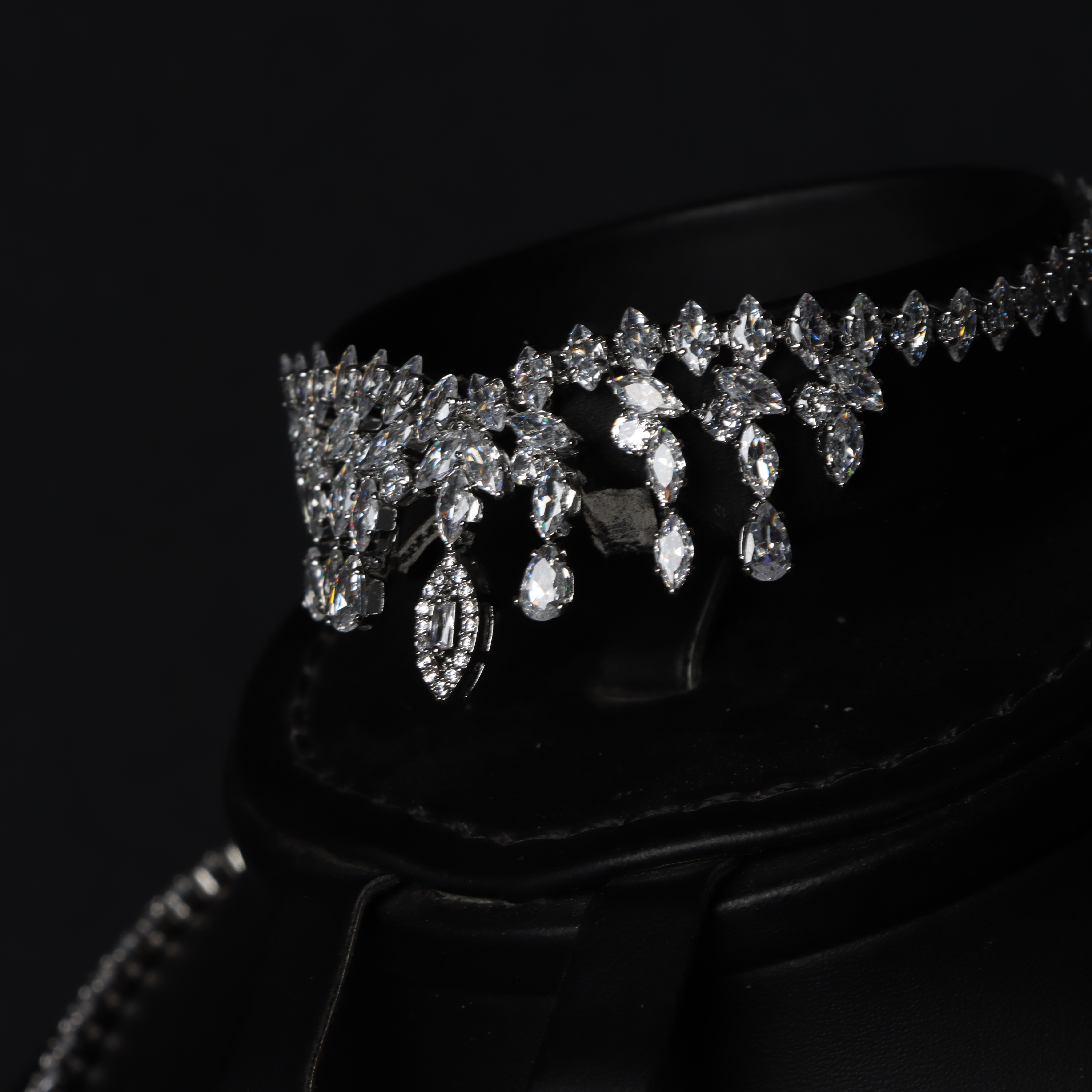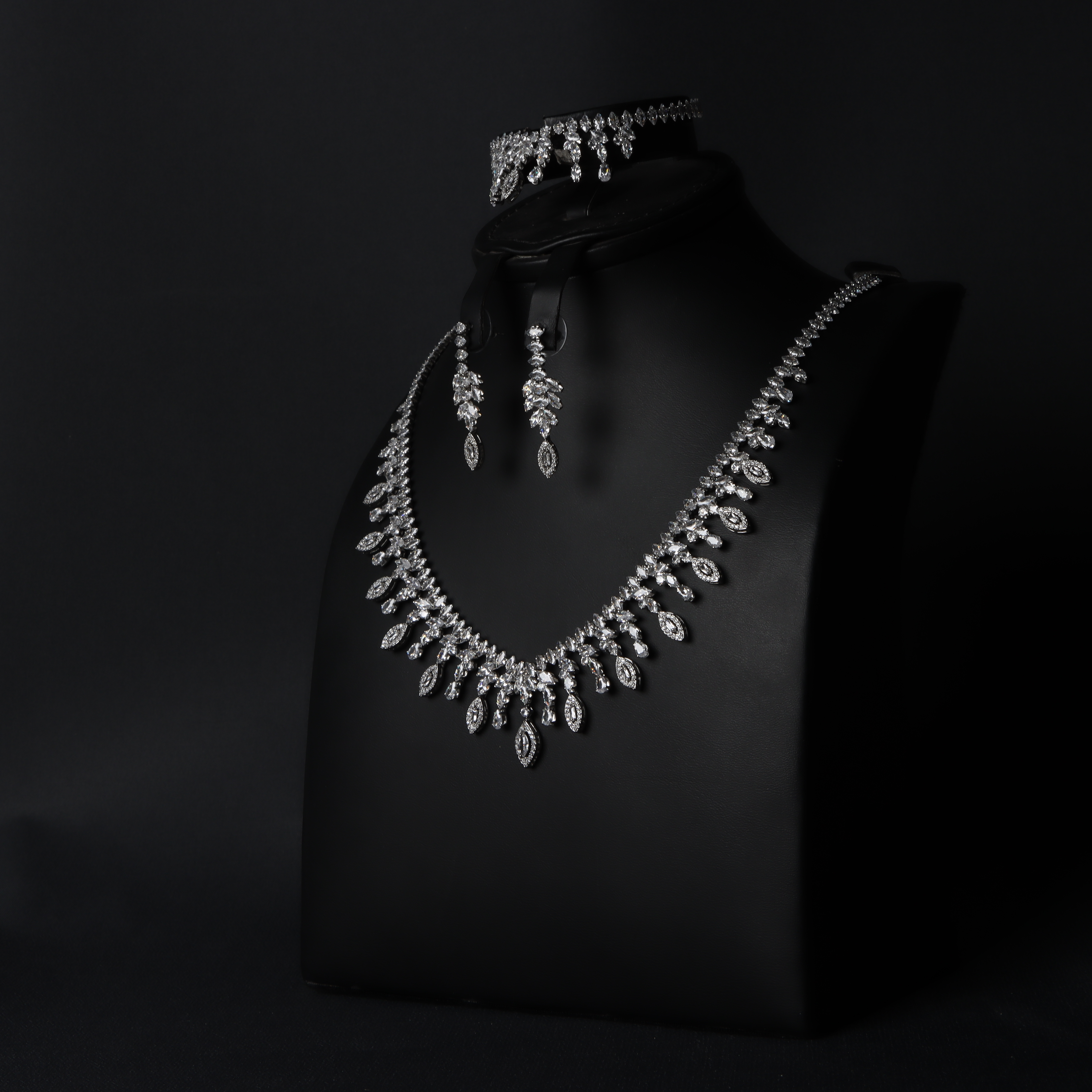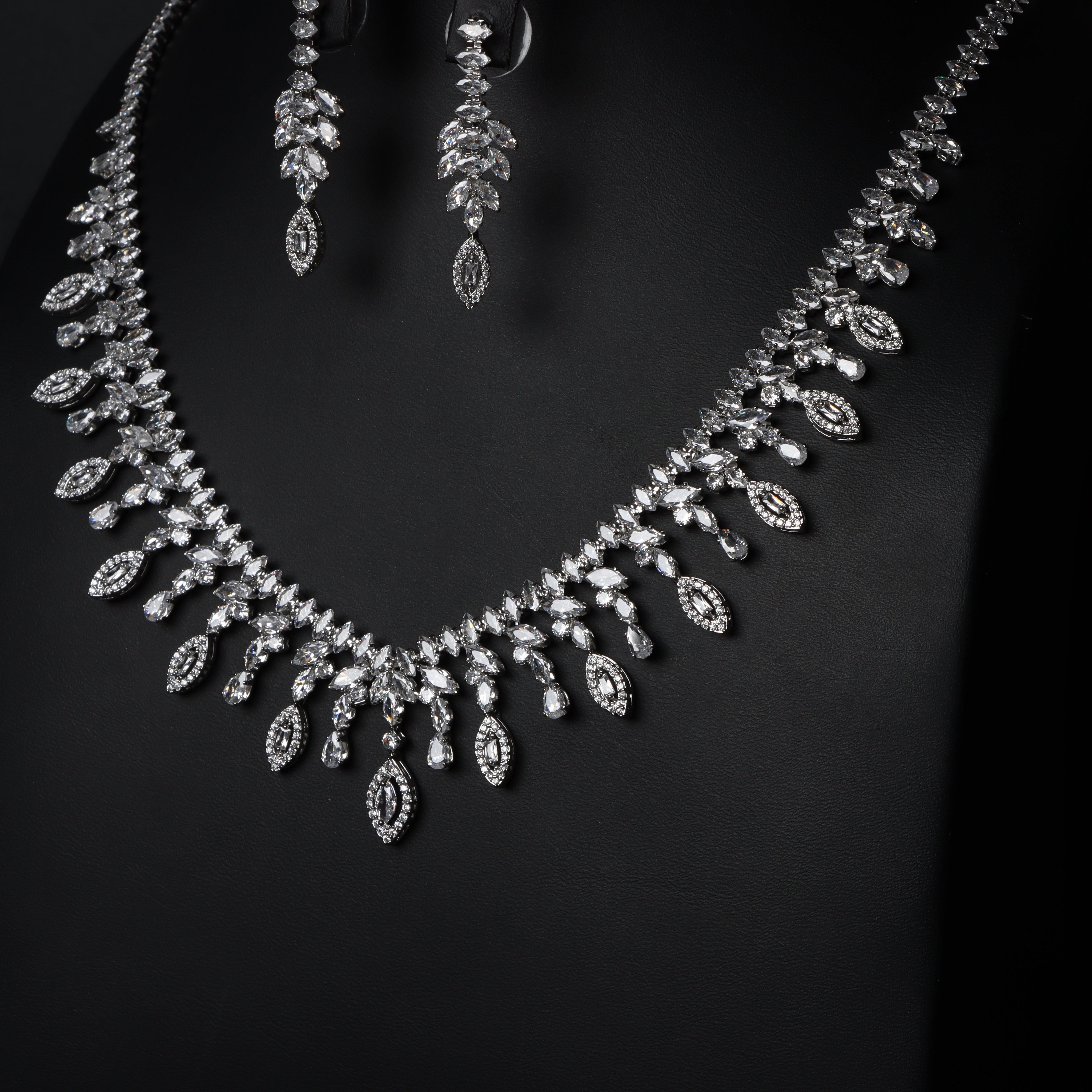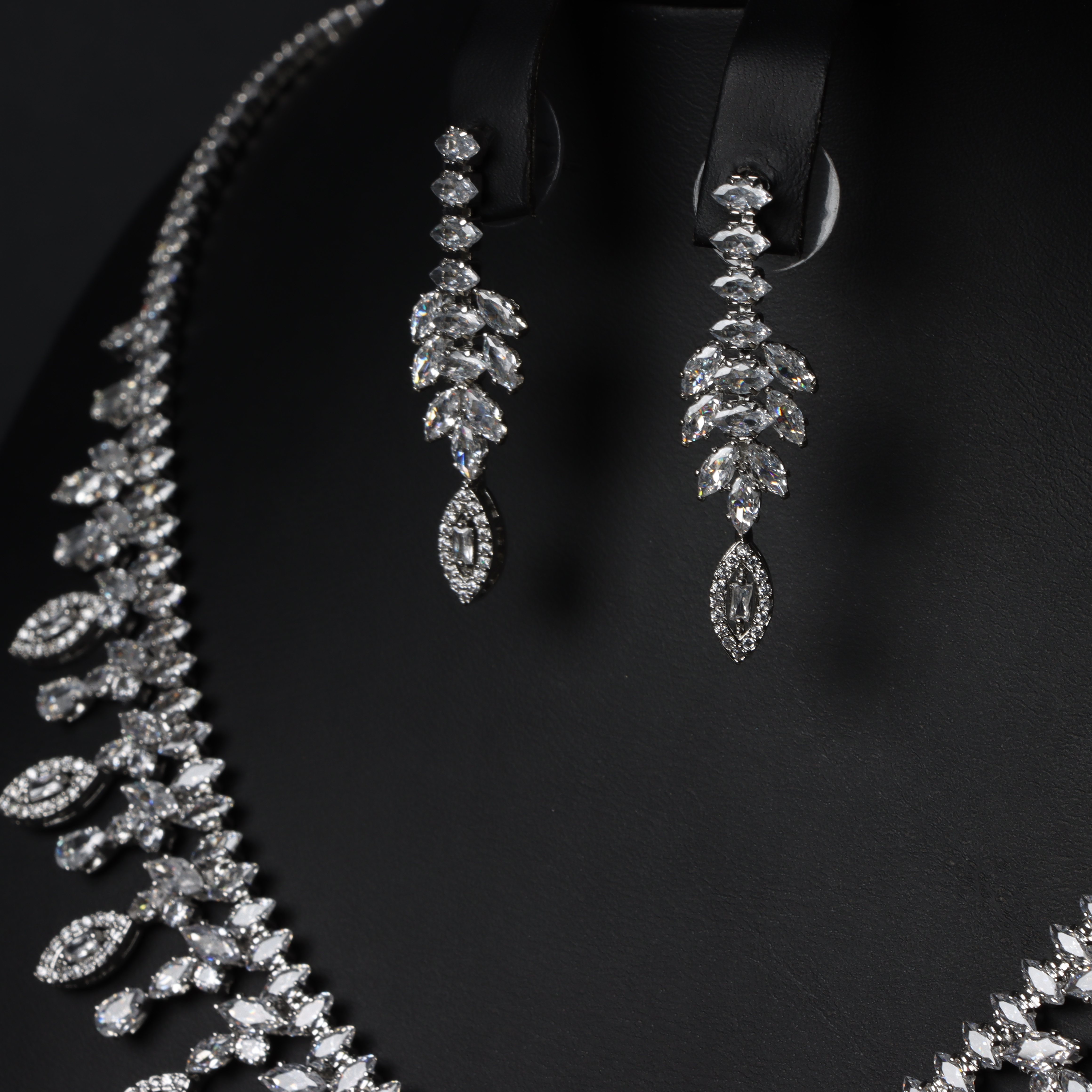 طقم بتصميم راقٍ يجمع بين البريق الفضي ولمعة أحجار الزركون عالية الجودة يتميز بأسلوب فاخر ولمسات متدلية تضيف انسيابية وأناقة على الإطلالة