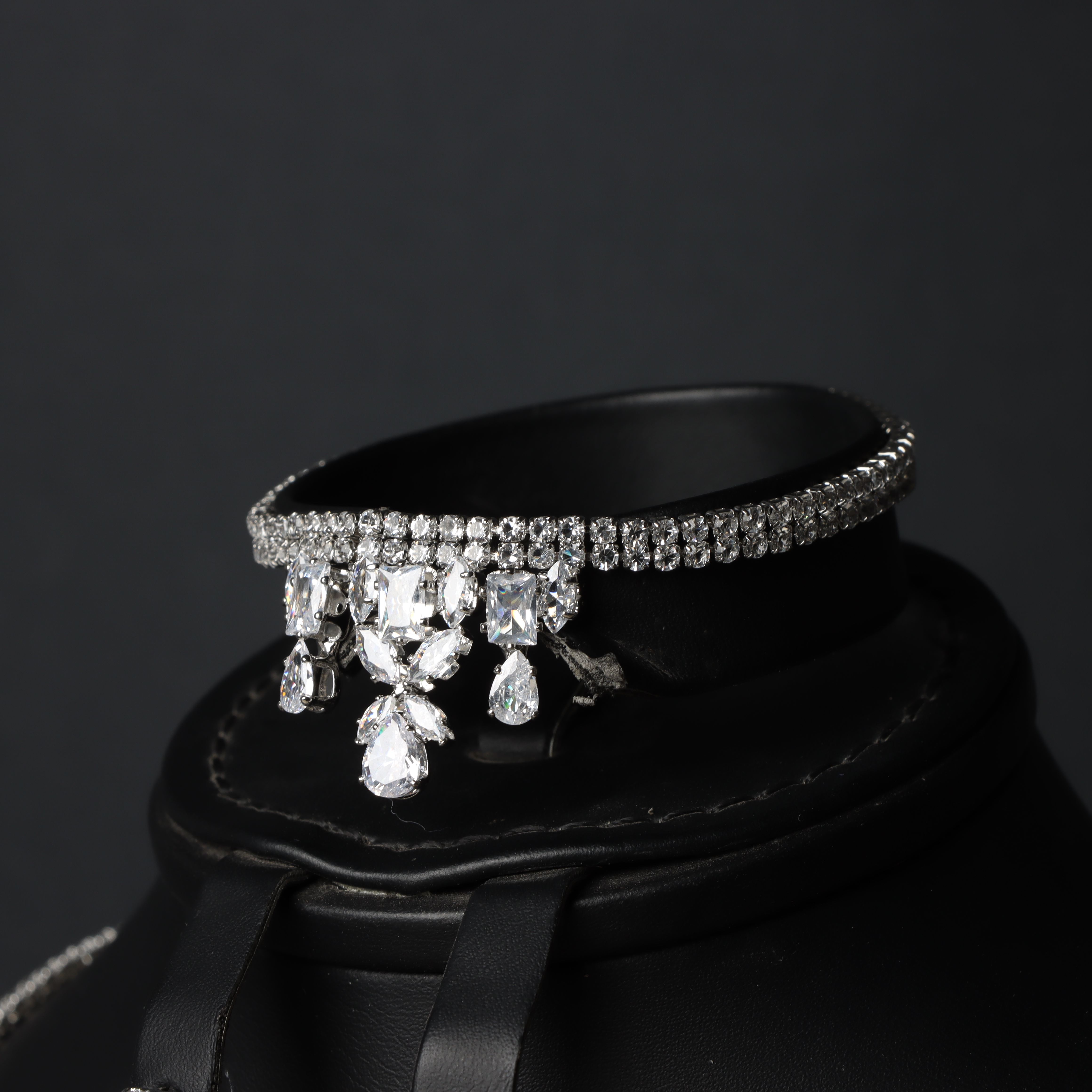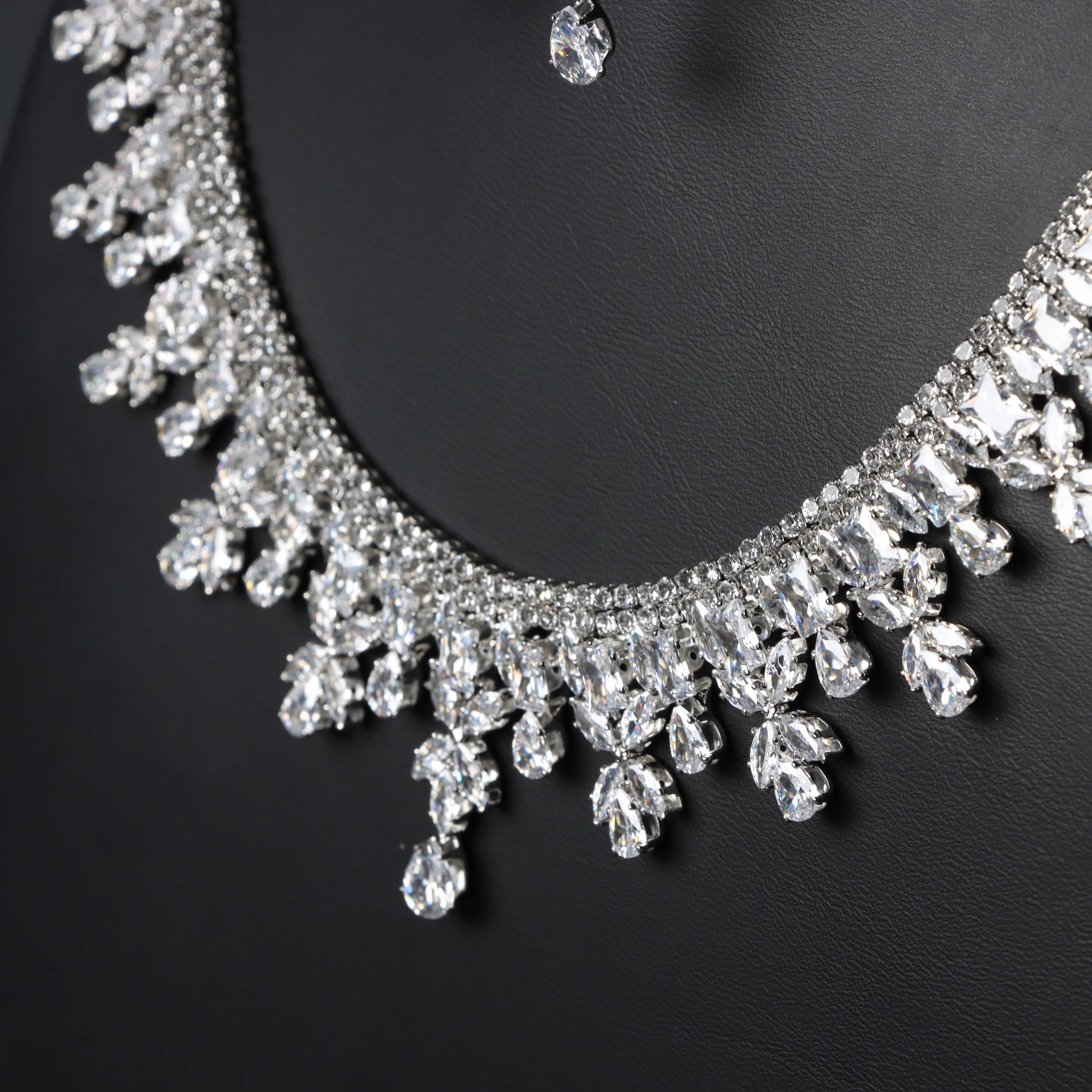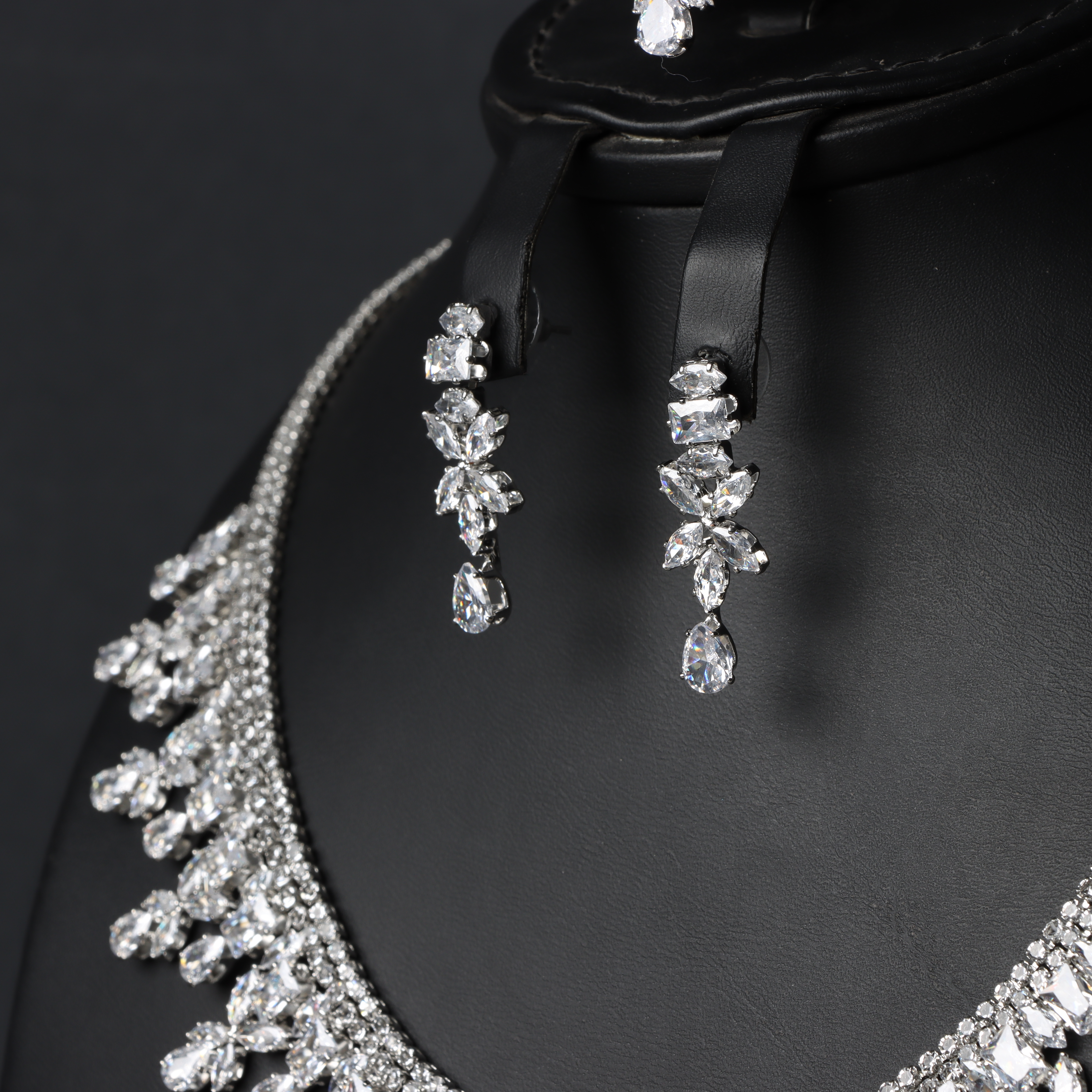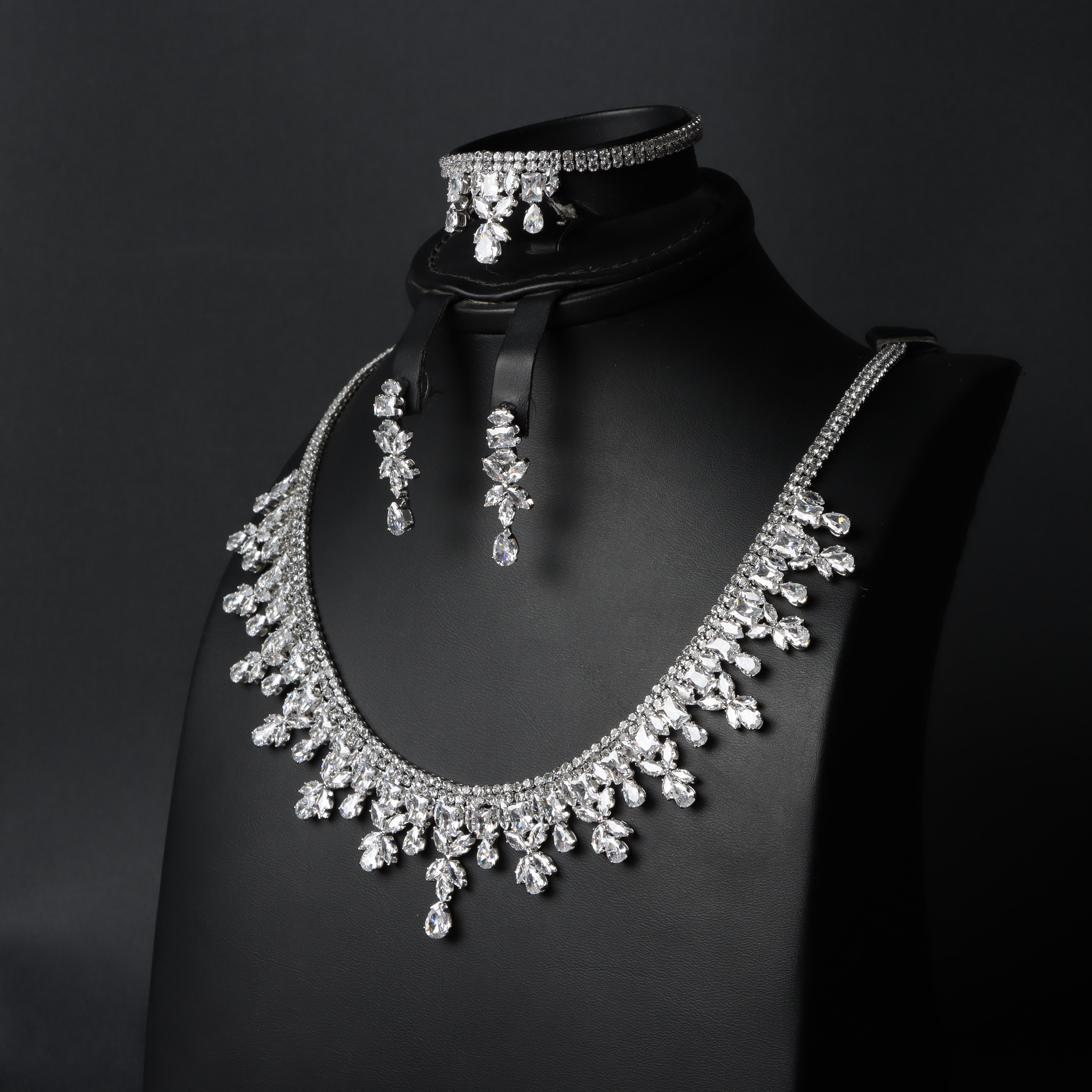طقم مجوهرات راقٍ يمنح إطلالة فاخرة بفضل لمعان الزركون المتناثر بتصميم جذّاب يبرز جمال العنق والوجه والمعصم