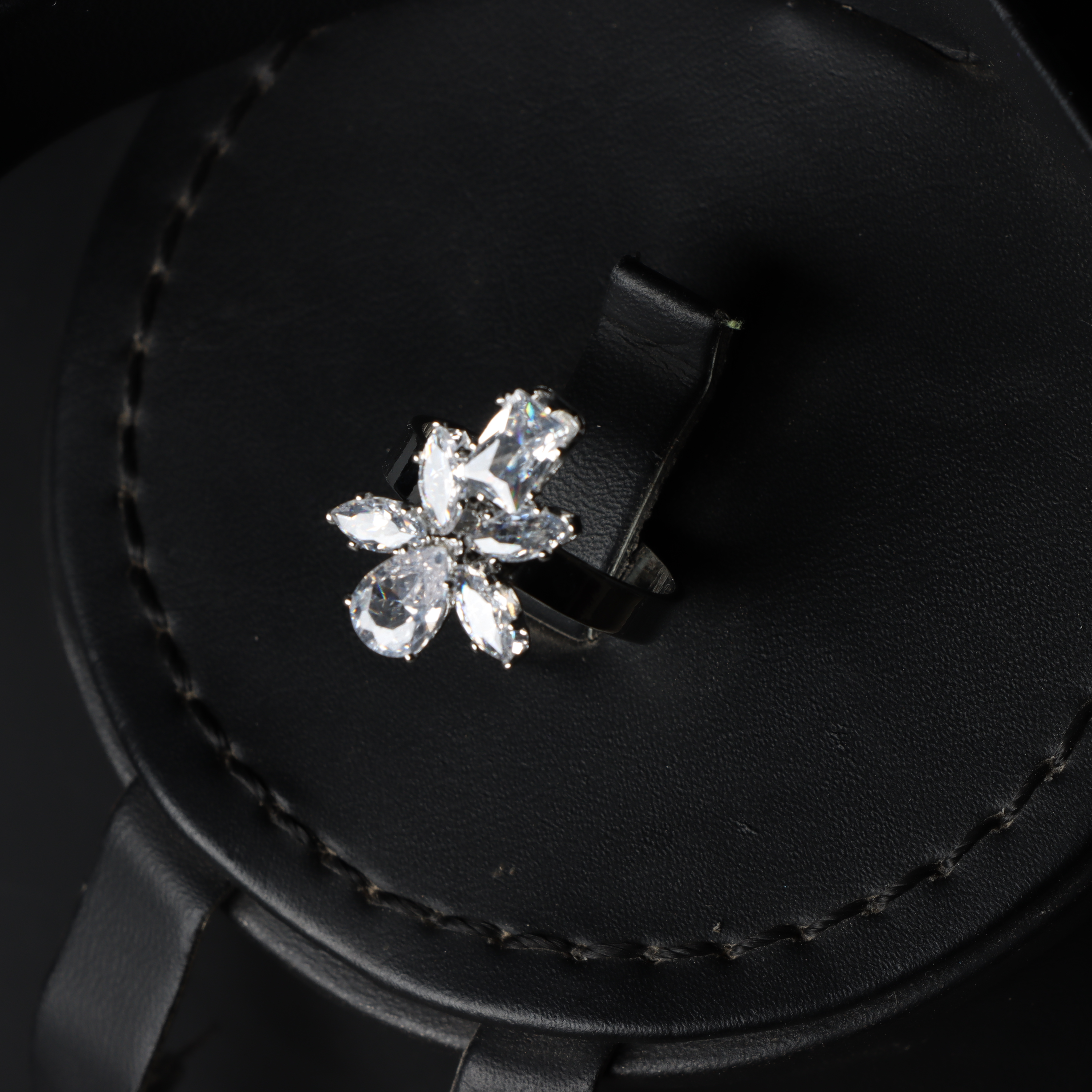 عقد نصف دائري فاخر مرصّع بزركون مع تدلّيات دمعة، أقراط مطابقة بزركون وحجر دمعة، واسوارة رفيعة مزينة بزركون، إضافة إلى خاتم أنيق يكمل الطقم بتناغم راقٍ |