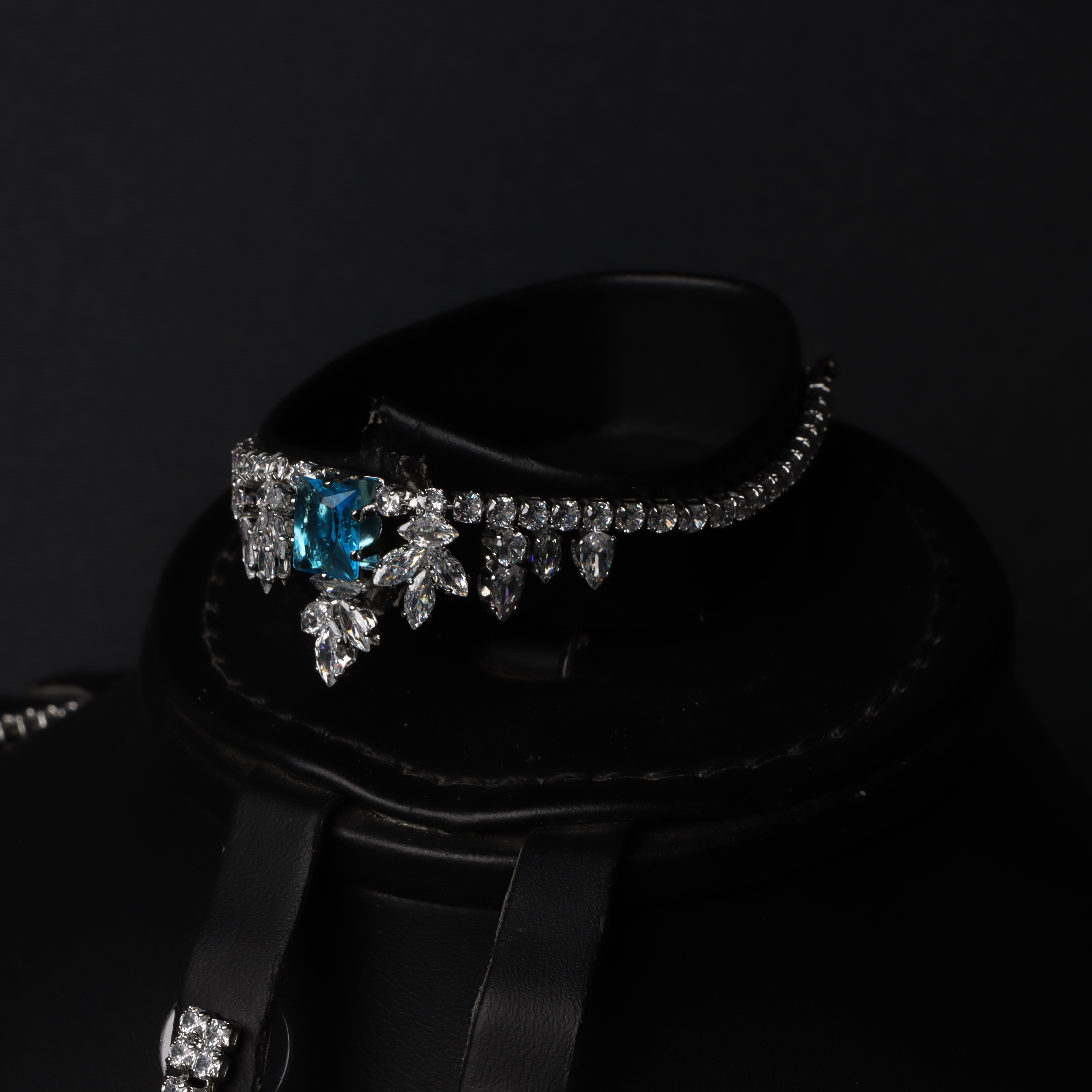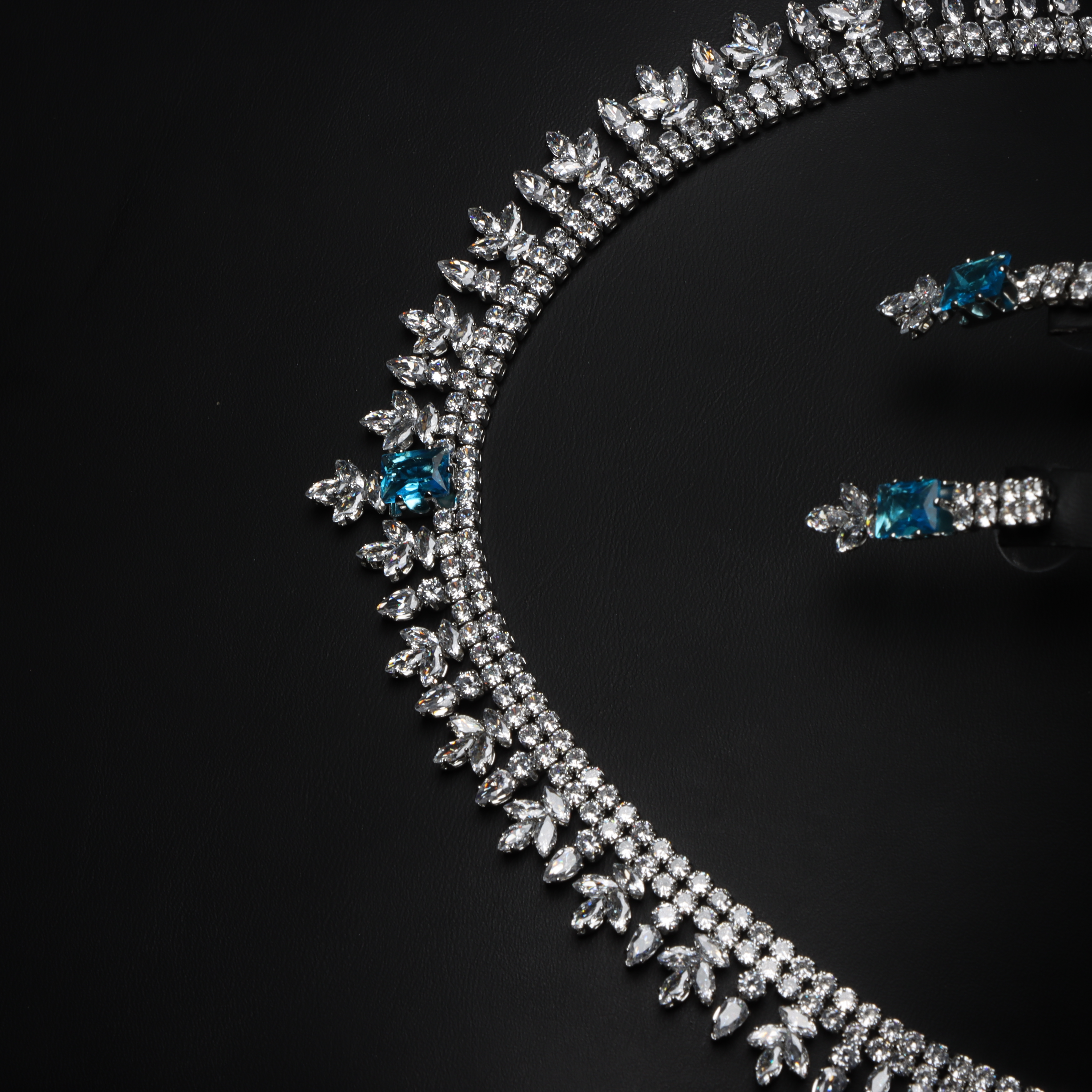عقد فضي مزدوج مرصّع بزركون مع حجر أزرق محاط بزركونات على شكل أوراق، أقراط متدلية متطابقة، واسوارة مزينة بحجر أزرق مشابه، إضافة إلى خاتم فاخر يكمل الطقم بتناغم |