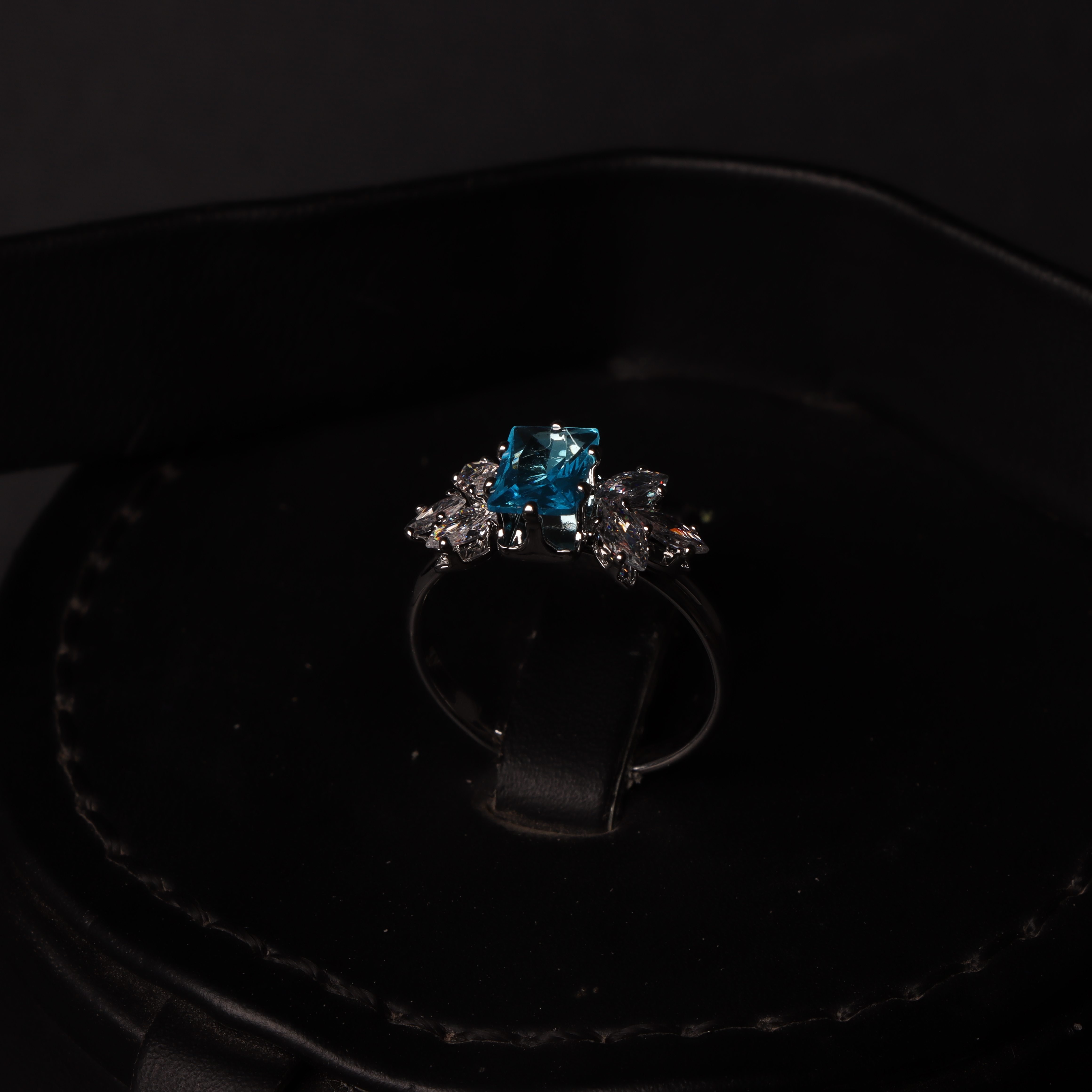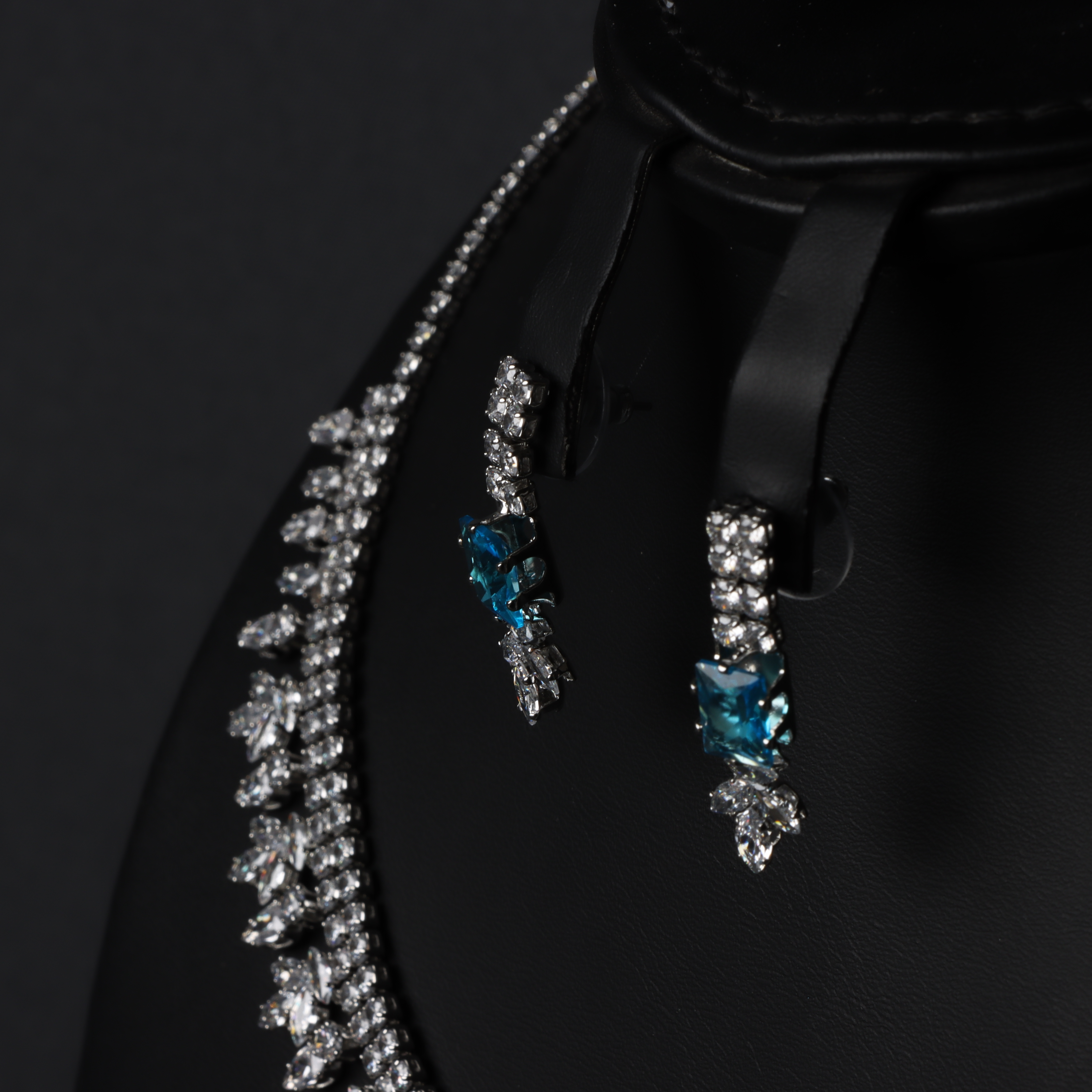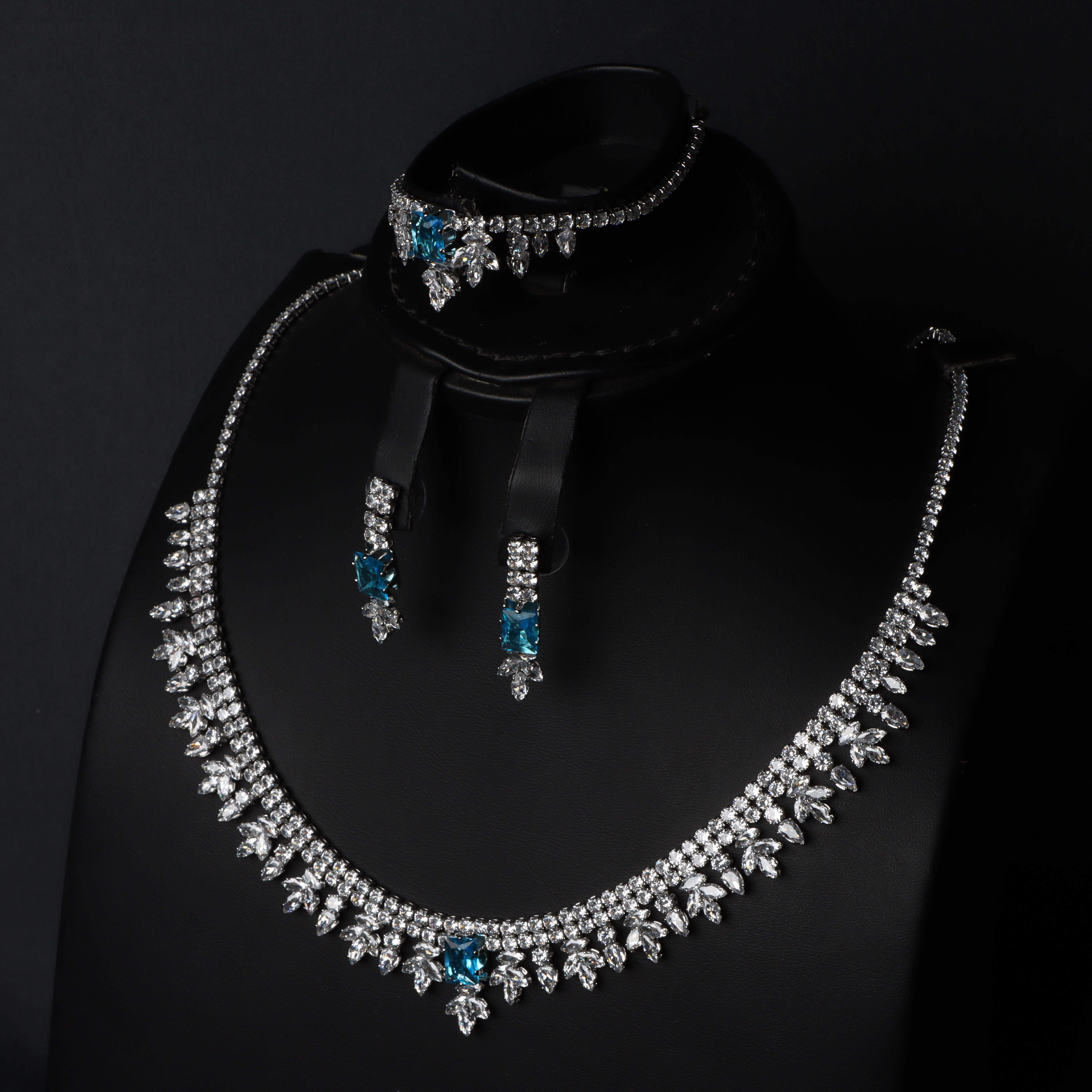 طقم مجوهرات فاخر بالزركون الأبيض وحجر أزرق بارز، يشمل عقدًا وأقراطًا واسوارة، مع خاتم أنيق، يمنح إطلالة أنثوية راقية للمناسبات المميزة