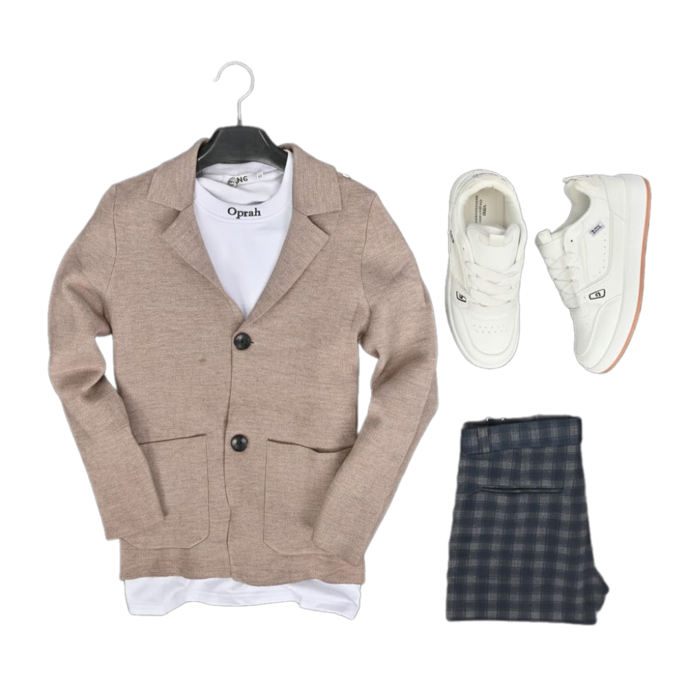 الجاكت بيج ,التيشرت ابيض,البنطلون رمادي |