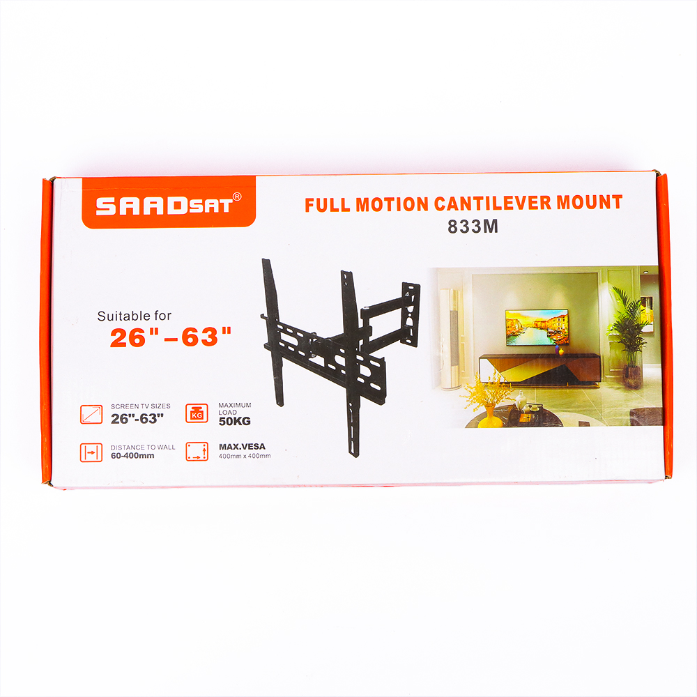 حامل جداري مصنوع من المعدن (عادةً فولاذ SPCC) بتصميم مفصلي مزدوج الذراع يسمح بمد الشاشة، تدويرها، وإمالتها لتناسب زوايا المشاهدة المختلفة.
