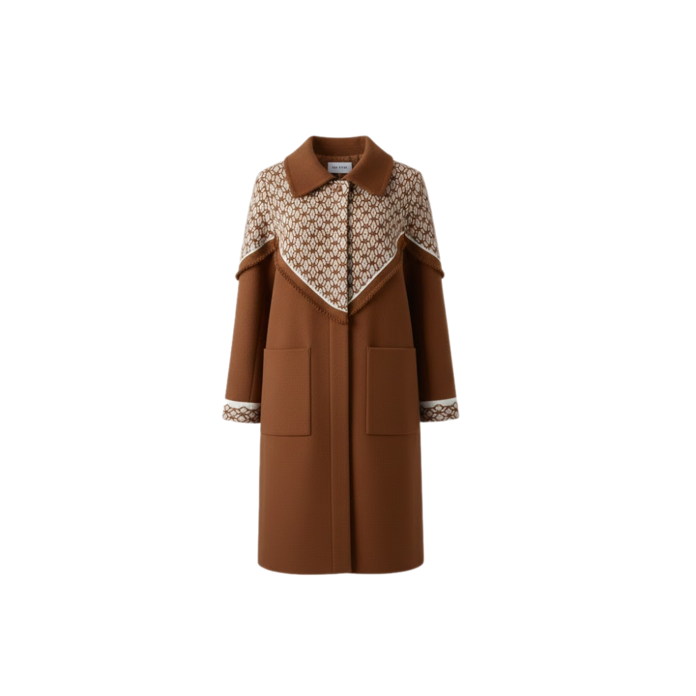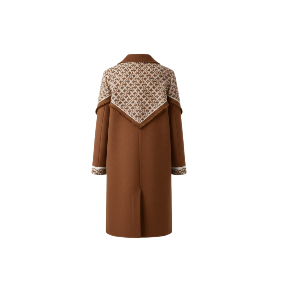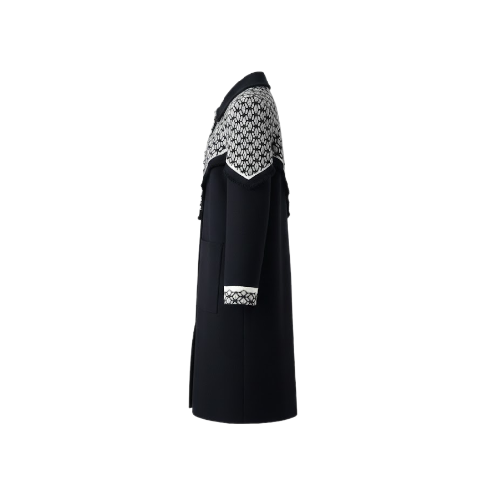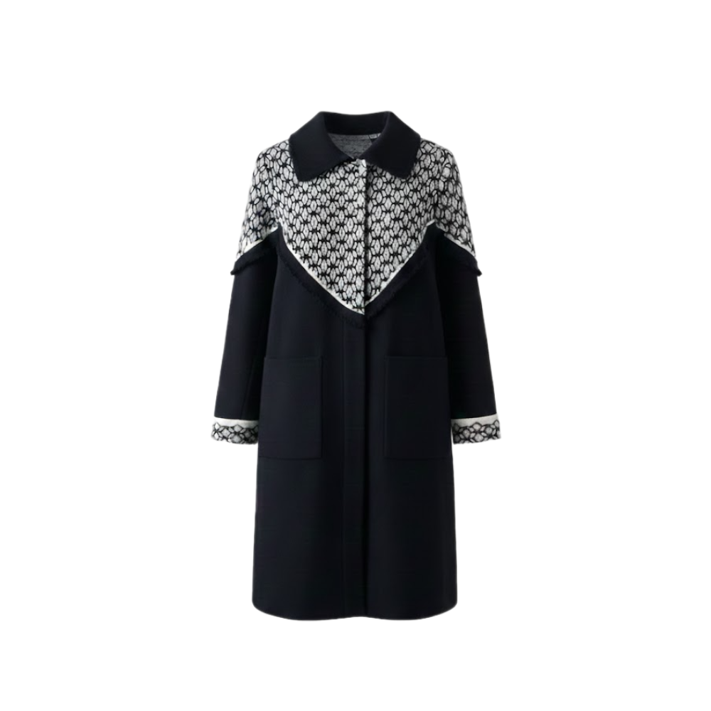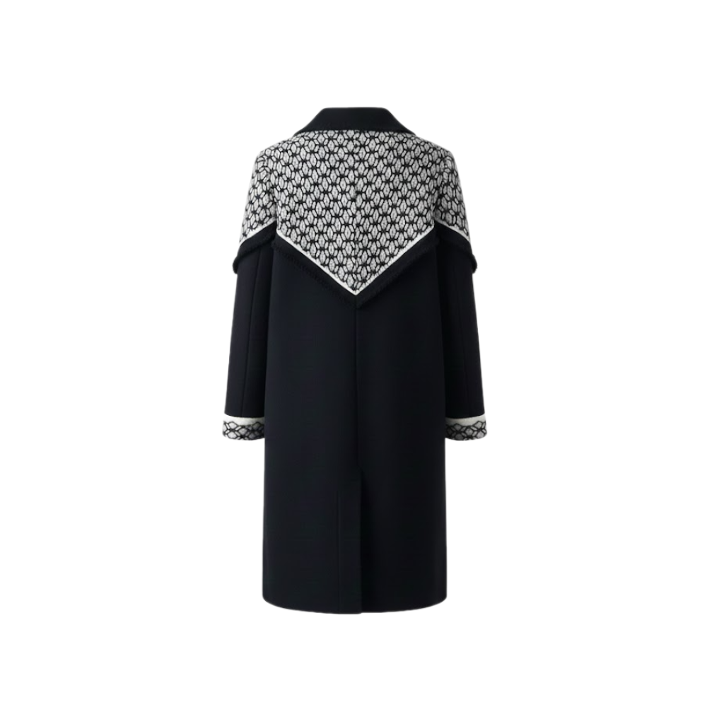 معطف صوفي فاخر يجمع بين الدفء والتصميم العصري ويُعد هذا المعطف قطعة أساسية تضفي لمسة من التميز والرقي على إطلالاتك اليومية والمسائية ويتميز الجزء العلوي، بما في ذلك الكتفين والأجزاء الأمامية، بنقشة هندسية مميزة مما يمنحه طابعًا فريدًا وجريئًا والجيوب كبيرة وواسعة مما يوفر مساحة عملية لوضع الأغراض الصغيرة أو تدفئة اليدين