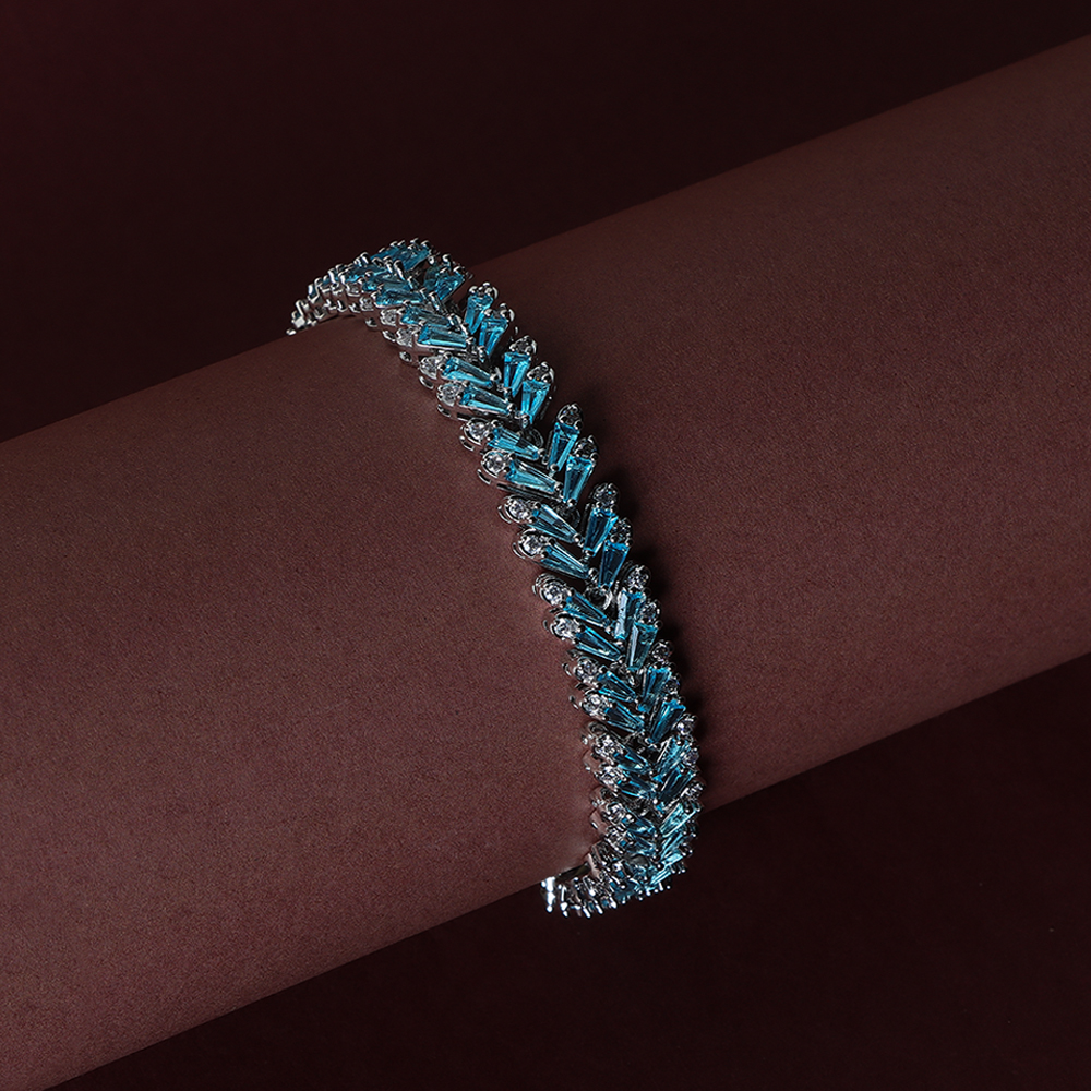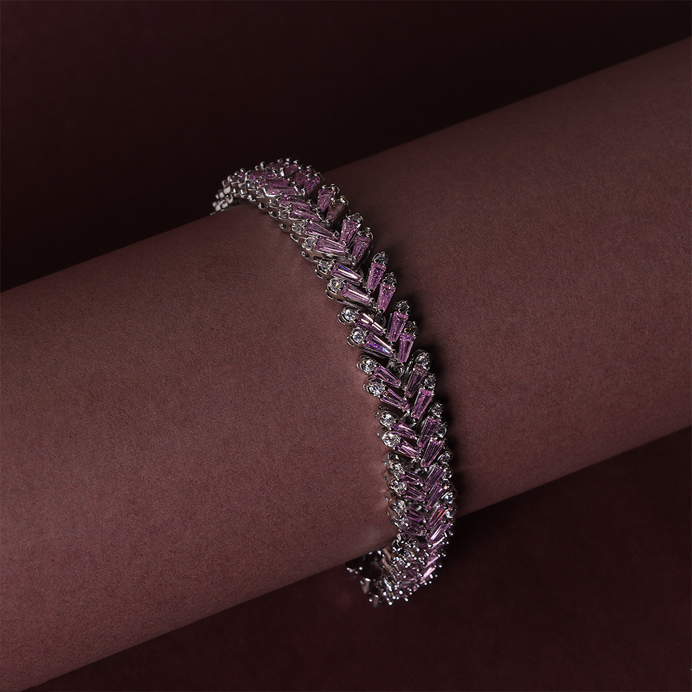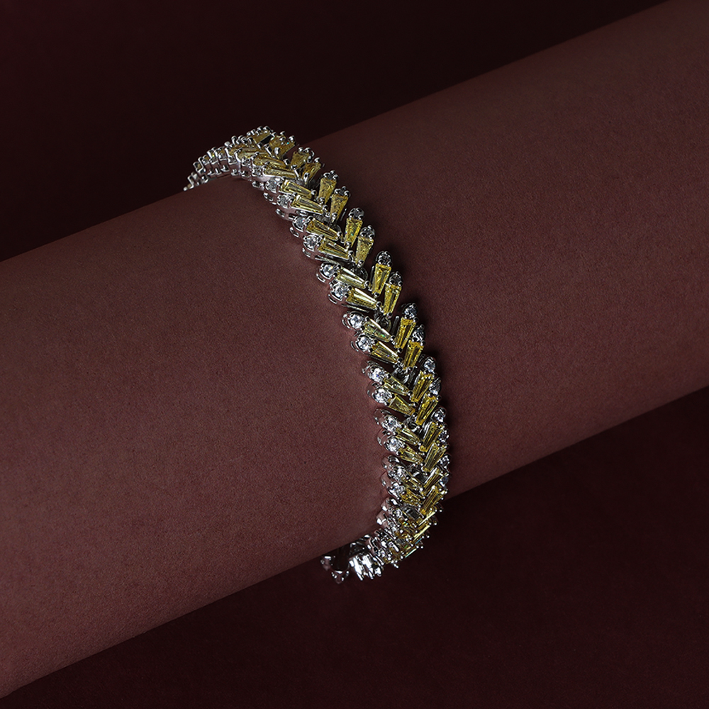 تصميم مزدوج اللون أحجار زركون بقَطع مستطيل (باكيت) مصفوفة بترتيب مائل يشبه زخارف الأوراق أحجار دائرية صغيرة موزعة بين الخطوط لتعزيز اللمعان قاعدة معدنية فضية عالية اللمعان تثبيت محكم للأحجار مع انحناءة مريحة حول المعصم |