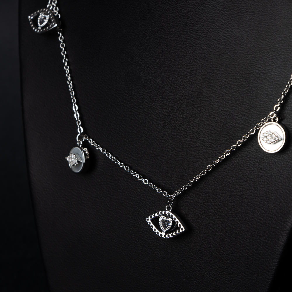 سلسال رقيق مزود بعدة تعليقات عين مرصعة بزركون براّق أقراط بنفس تصميم العين لإطلالة متناسقة لون فضي كلاسيكي مناسب لكل الإطلالات |