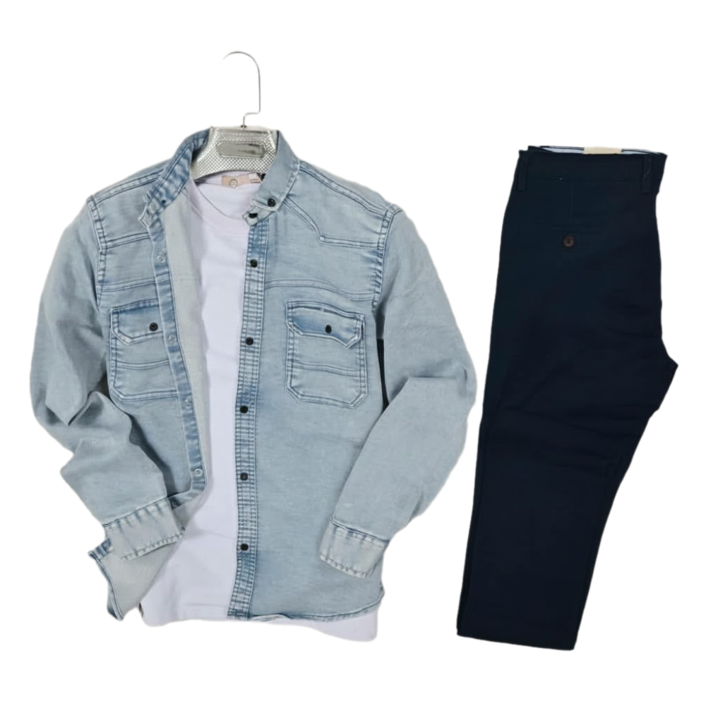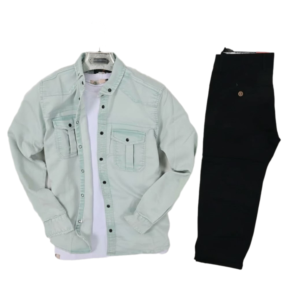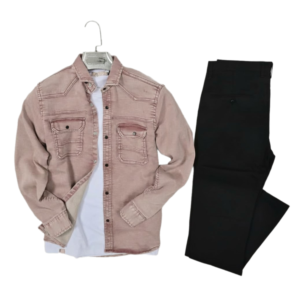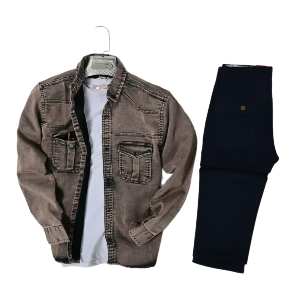 طقم عصري سمارت كاجوال الرجالي. يجمع الطقم بين قطعة خارجية ذات مظهر خشن ومُغسول يعكس طابعًا قويًا ومغامرًا، مع قاعدة داخلية فاتحة تعمل على إضاءة الإطلالة. ويكتمل التنسيق بقطعة سفلية داكنة وهادئة توفر الأساس الكلاسيكي، مما يوازن المظهر الكاجوال للطبقة العلوية. تُناسب هذه المجموعة الأجواء غير الرسمية وتوفر مظهرًا مريحًا في الوقت ذاته.
