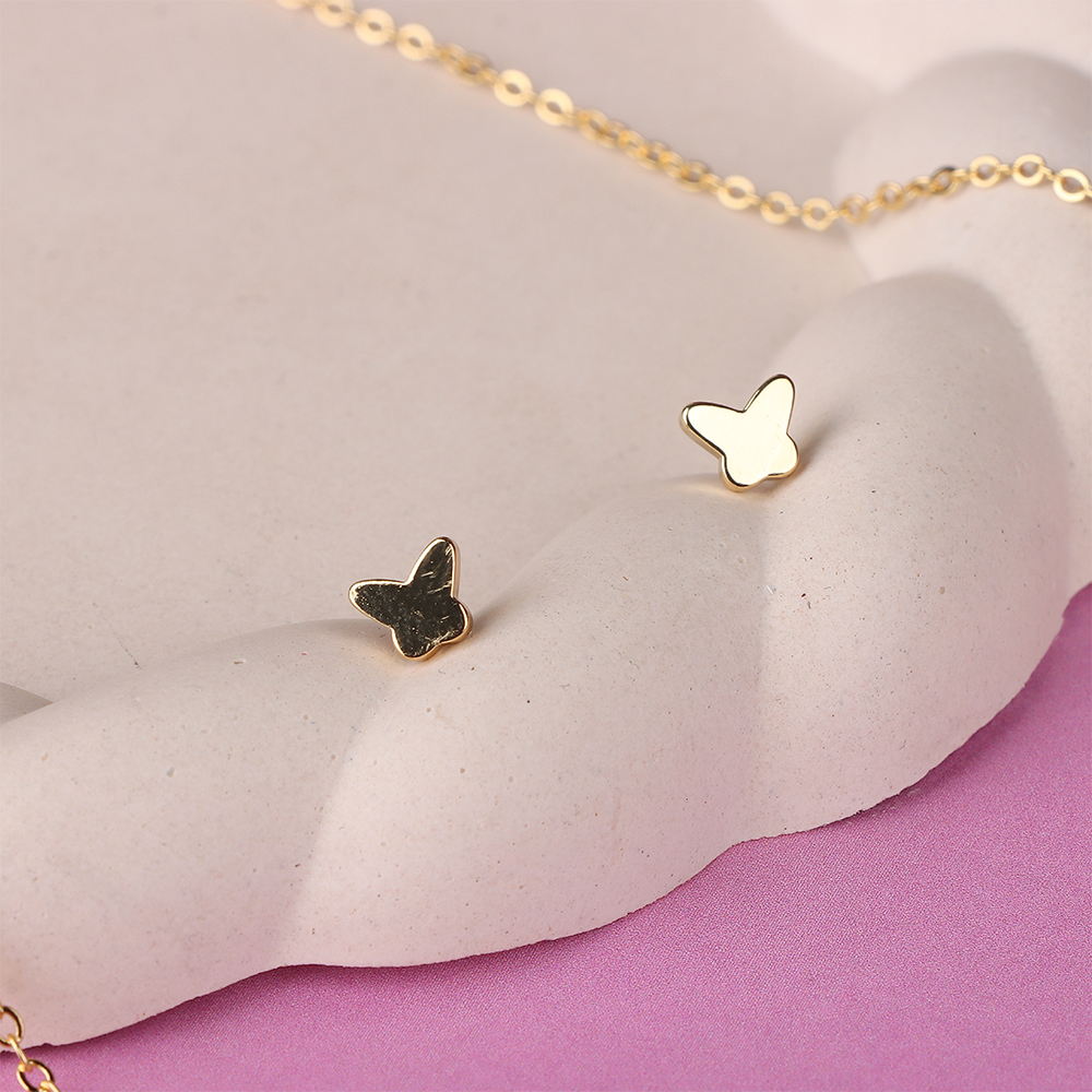 سلسال ذهبي خفيف مع تعليقات فراشة ولمسات زركون متناثرة، مع أقراط فراشات صغيرة بتصميم أنثوي جذاب |
