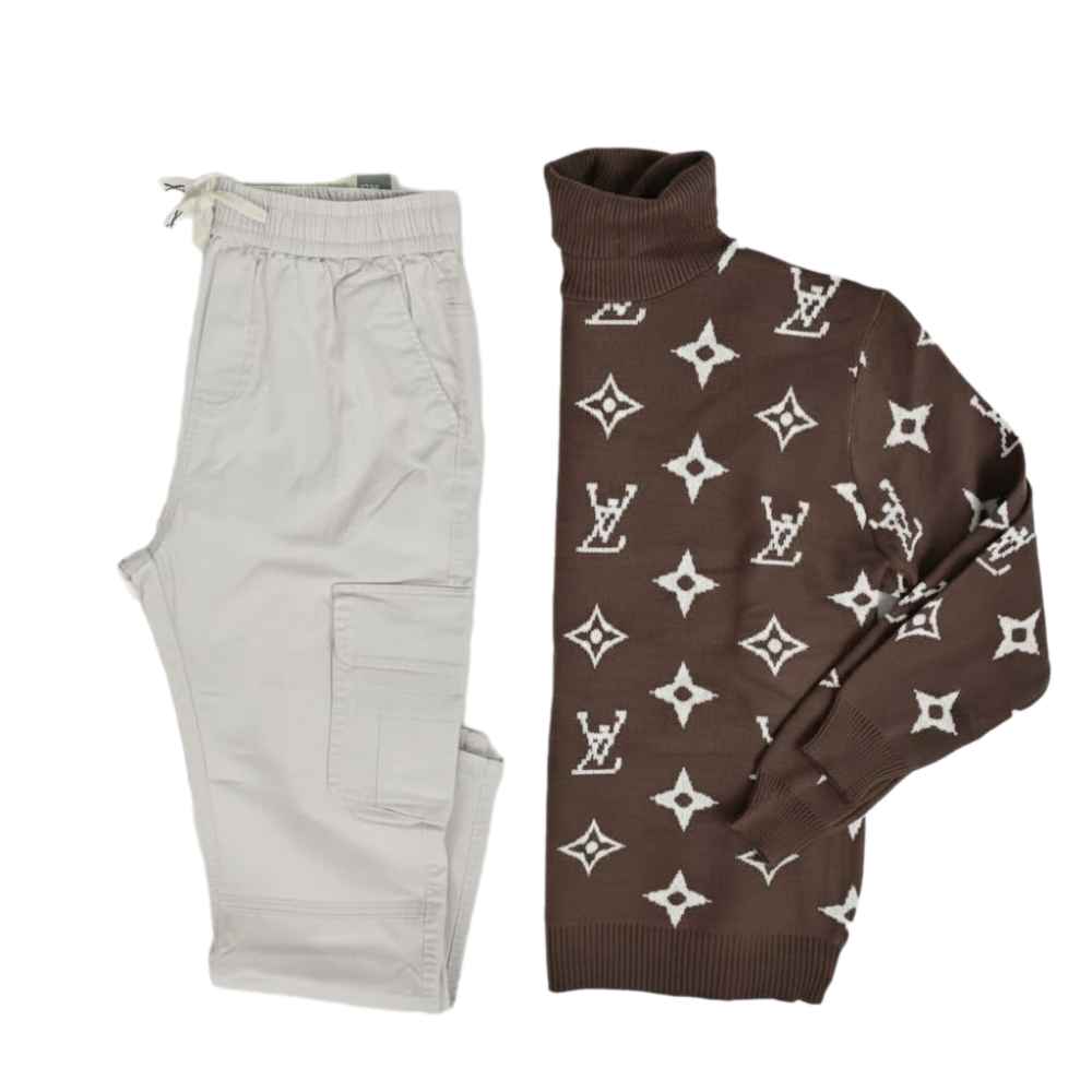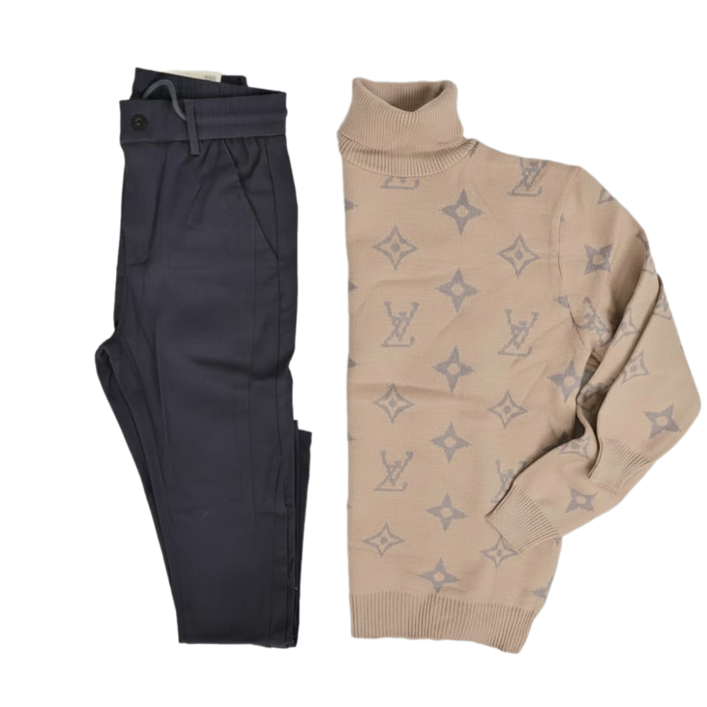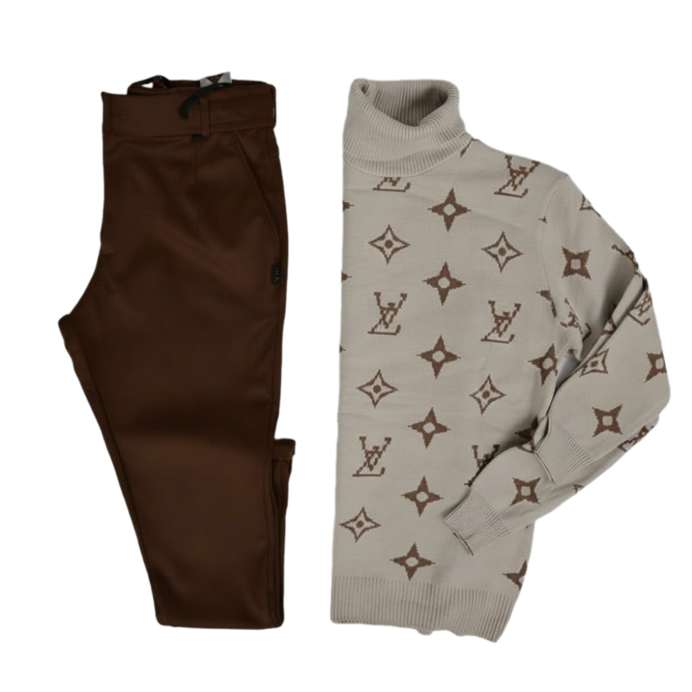 طقم رجالي سمارت كاجوال شتوي، تمزج القطعة العلوية ذات الياقة العالية والمزينة بنقشة لافتة بين الدفء والأناقة الفاخرة. الكنزة المنسوجة توفر الحماية من البرد وتضفي طابعاً راقياً. تُكملها القطعة السفلية بنطلون كلاسيكي حديث ، المظهر يوفر قاعدة صلبة ومريحة للإطلالة. التناسق اللوني بين القطعتين يخلق مزيجاً هادئاً ومتناغماً، مما يجعل هذا الطقم مناسباً للخرجات اليومية والأوقات غير الرسمية التي تتطلب مظهراً أنيقاً ومميزاً في فصل الشتاء.