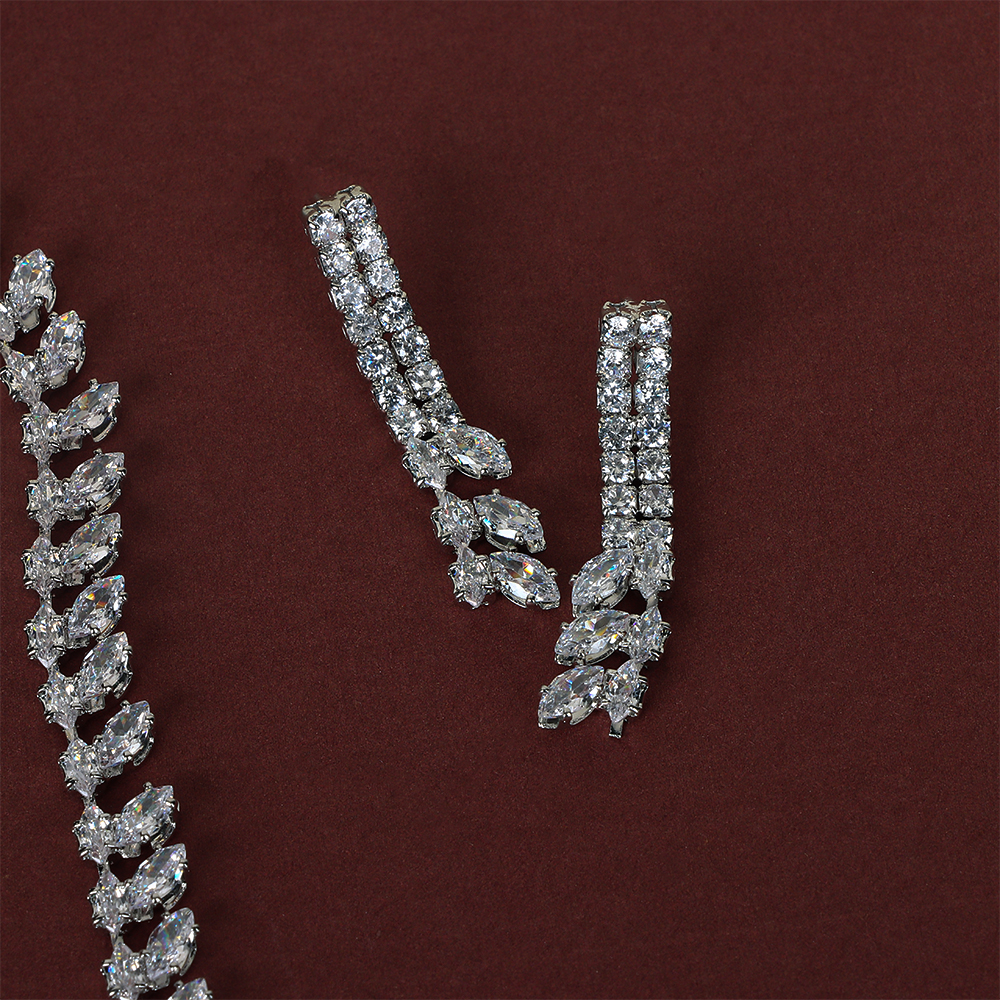 سلسال فضي بتنسيق أحجار متعددة الأحجام، مع تفصيلة أمامية تزيد من اللمعان والجاذبية، مرفق بأقراط منحنية مرصعة بنفس النمط لإطلالة متكاملة