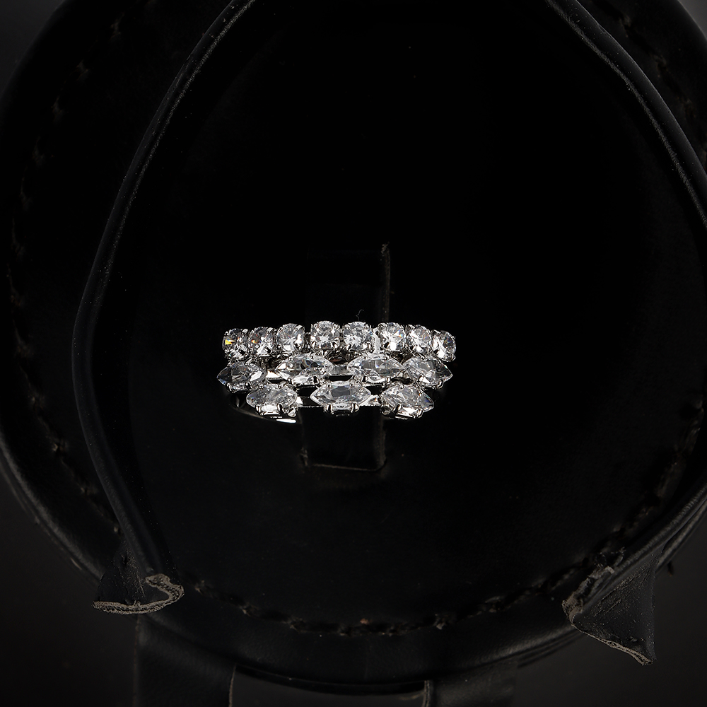 سلسال مطرّز بفصوص متدرجة بتصميم فاخر، مع أقراط طويلة منسابة، وإسوارة متناسقة بنفس النمط، إضافة إلى خاتم بتصميم مطابق لرفع جاذبية الطقم وتكامل الإطلالة |