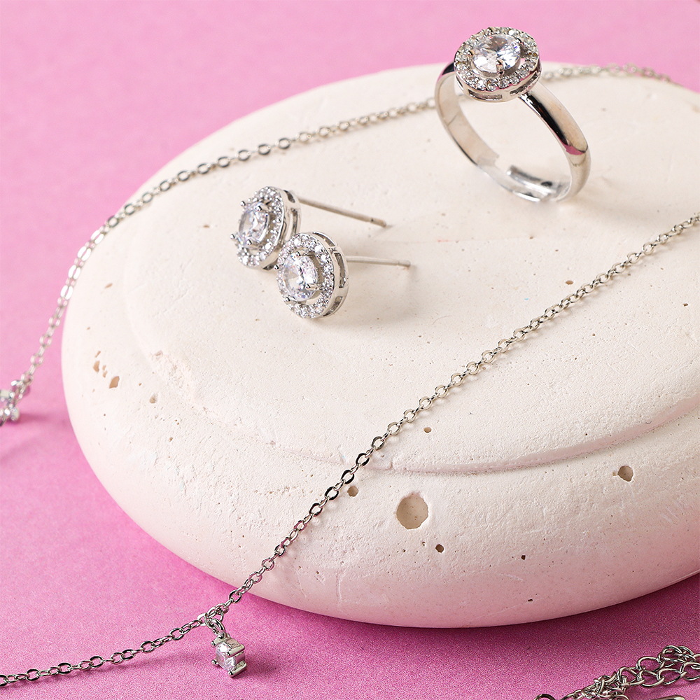 عقد رقيق بحليات زركون متناثرة، أقراط دائرية بحجر مركزي محاط بلمعات دقيقة، خاتم متناسق بنفس الأسلوب، إضافة إلى أسوارة ناعمة تكمل الطقم بتناغم راقٍ |