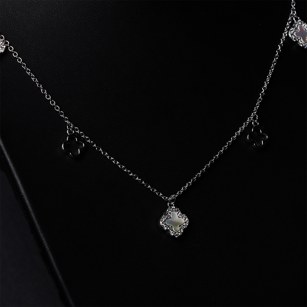 سلسال رقيق مع تعليقات مربعة مرصعة بفصوص لامعة، وأقراط بنفس التصميم لانسجام كامل في الإطلالة |