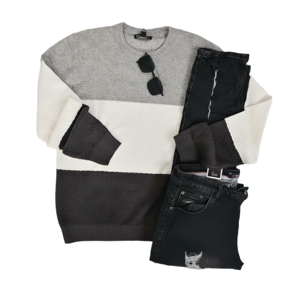 طقم شتوي أنيق وكاجوال، تتألف من سويتر بتصميم مقسم بثلاثة ألوان داكنة ودافئة منسقة مع بنطلون جينز كلاسيكي. إطلالة الطقم يومية عصرية ومريحة تناسب معظم الأنشطة الاجتماعية غير الرسمية.